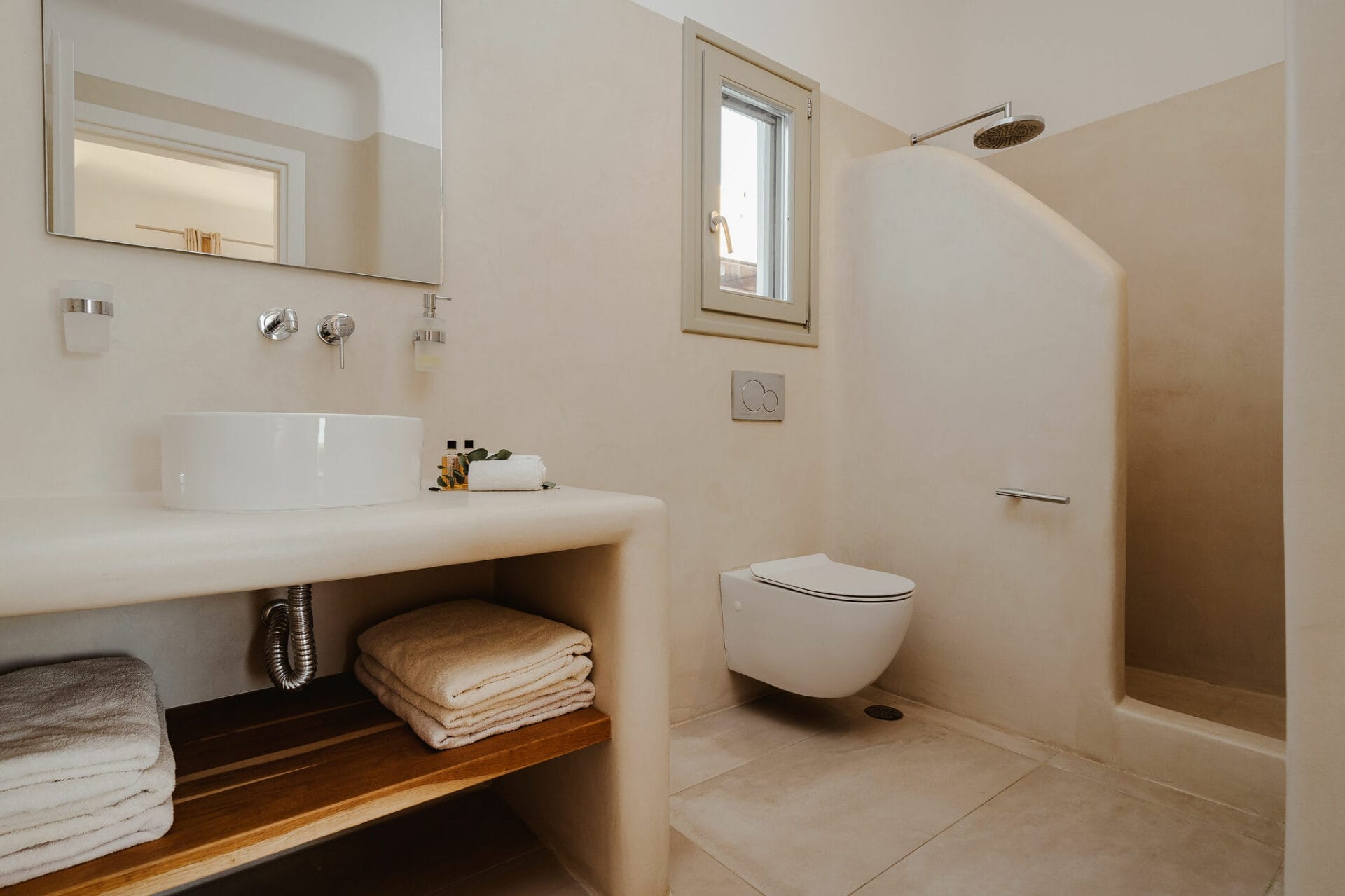 This villa showcases the bright white elegance of Cycladic architecture, with interiors that balance luxury and comfort. Spanning two levels, it offers four en suite bedrooms, each with direct outdoor access and sea views. Modern décor, crisp white tones, and earthy accents create a welcoming atmosphere.