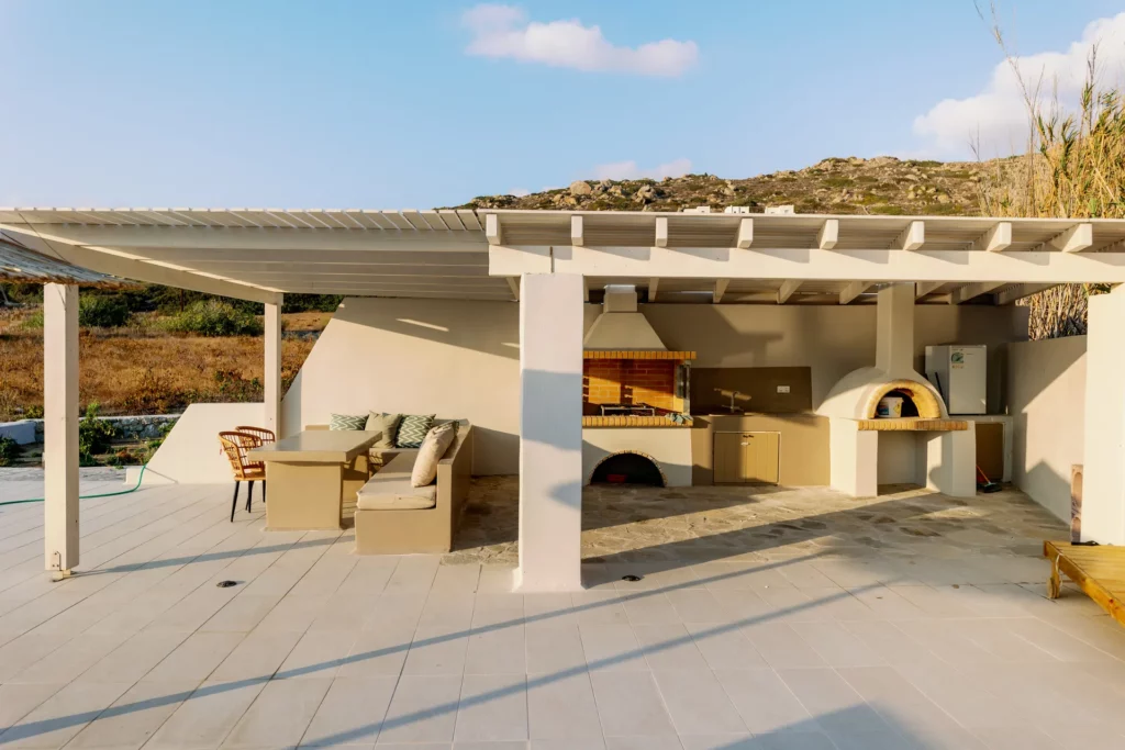 The villa includes three bedrooms with queen beds, one children’s room with two smaller doubles, and four bathrooms. With its bright interiors, fully equipped kitchen, and relaxing outdoor spaces, Villa Mia offers the perfect setting for a comfortable and memorable stay in Naxos.
