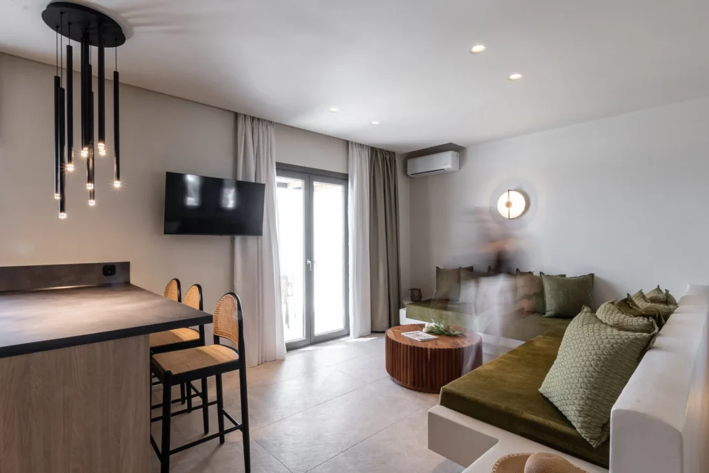 Guests enjoy direct access to Plaka’s 4 km stretch of white sand and crystal waters, with nearby beach bars, restaurants, and cafés. Comfort, style, and location combine for a luxurious Naxos escape.