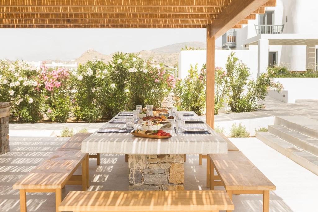 Each villa has a private outdoor area with a pool, sun loungers, and a shaded dining space. Combining Cycladic style with modern amenities, the villas offer a relaxed and comfortable stay.