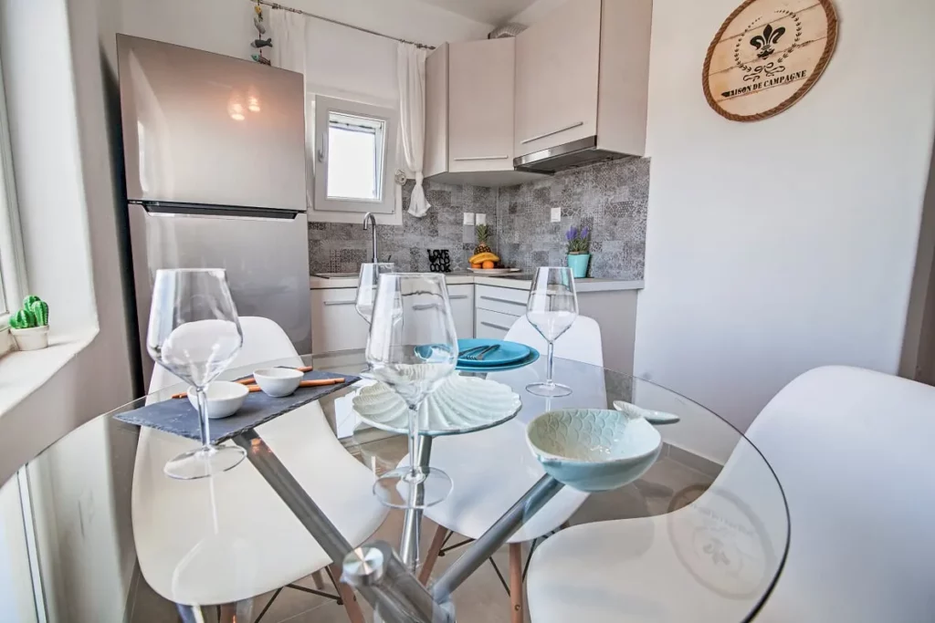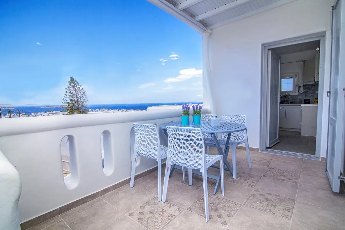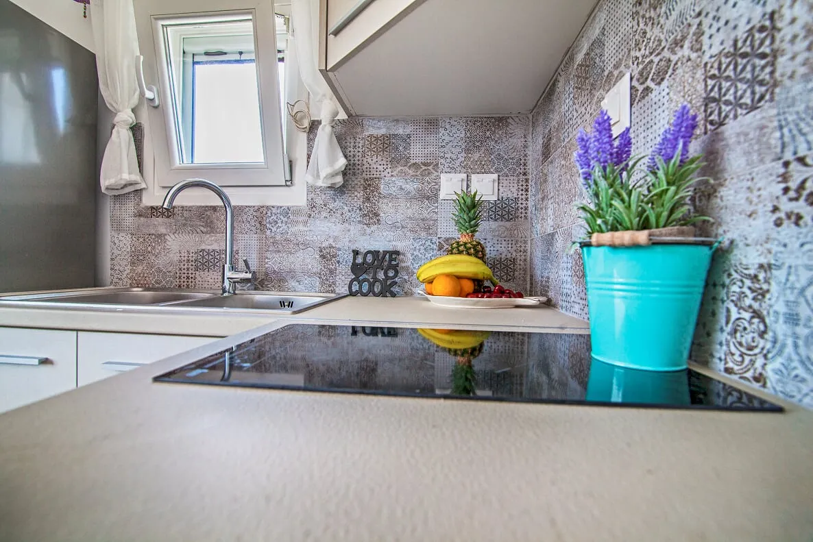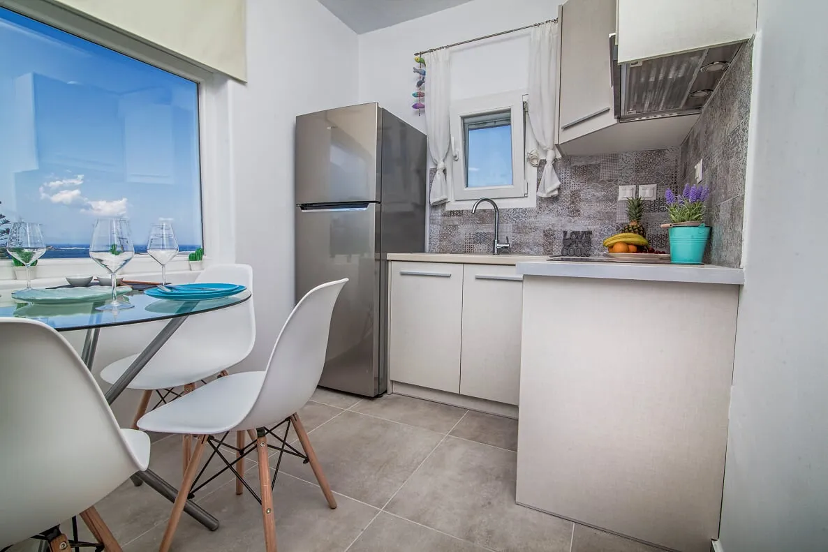 Open plan living area with a well-equipped kitchen, opening onto a terrace with a dining table and stunning views of the bay of Kalafatis.