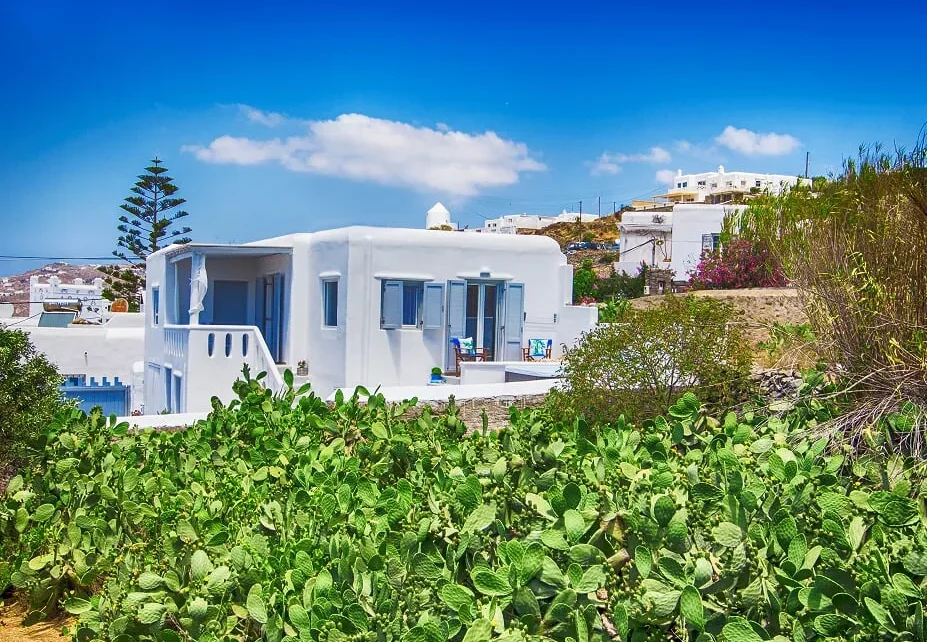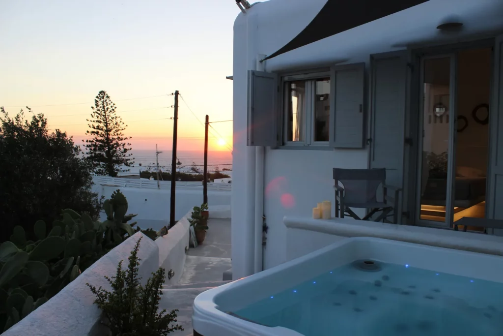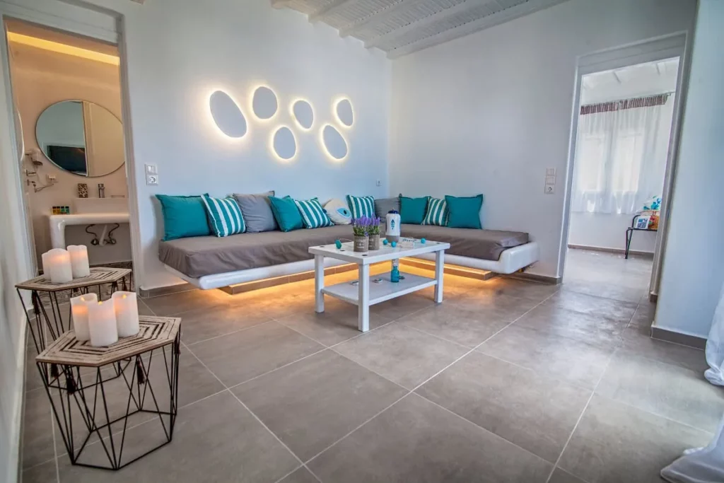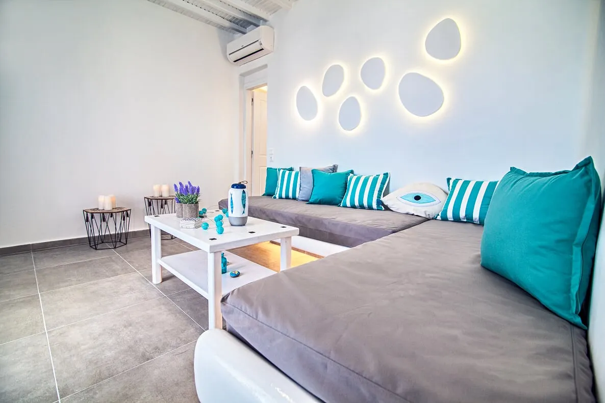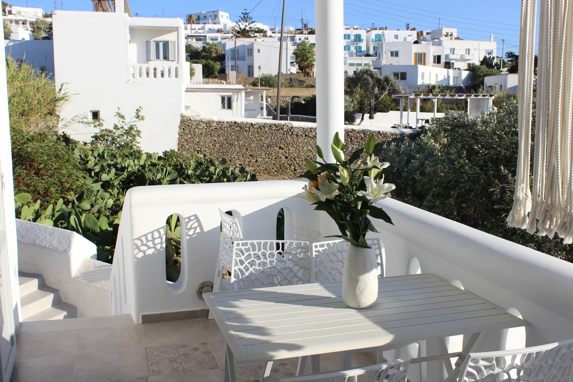 Open plan living area with a well-equipped kitchen, opening onto a terrace with a dining table and stunning views of the bay of Kalafatis.