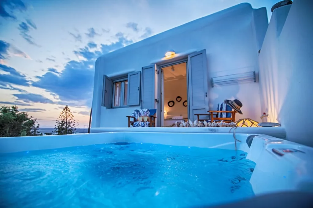 Step outside onto the terrace with a private pool, sun loungers, and alfresco dining area.