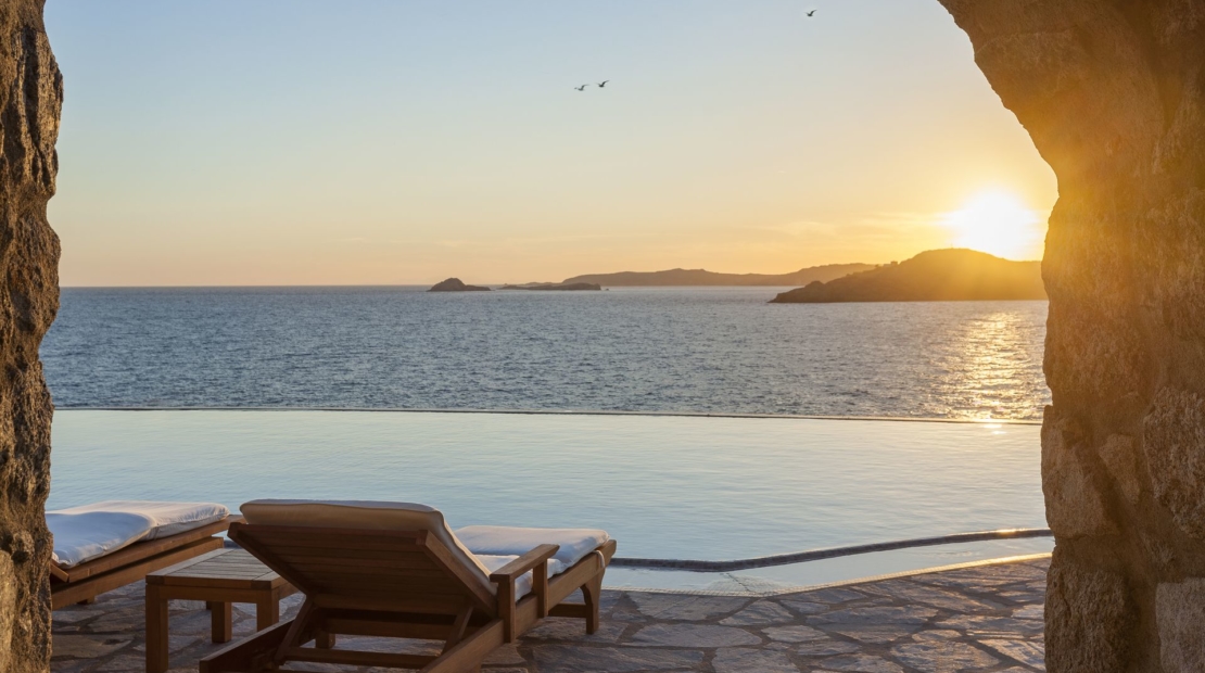 The outside area consists of layered sun terraces with a 118sq meter infinity swimming pool, sun loungers, alfresco dining, and various cozy corners for quiet relaxation.