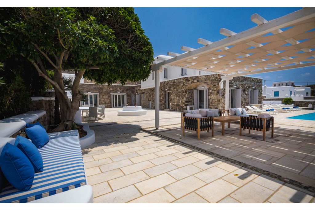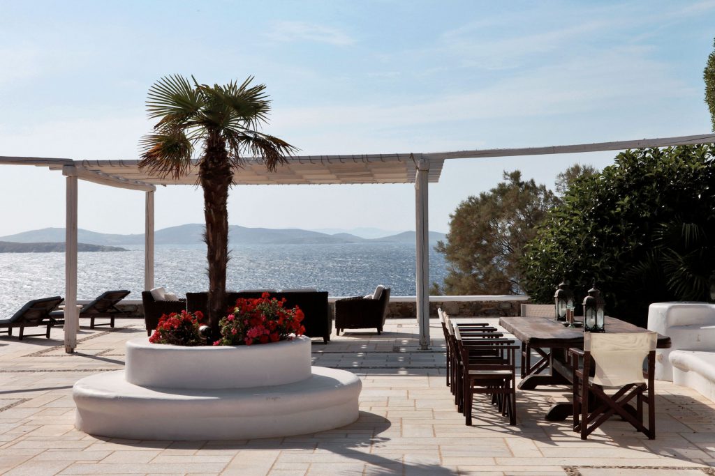 The large outside terrace offers a shaded dining area, lounge seating, and a good-sized private infinity swimming pool.