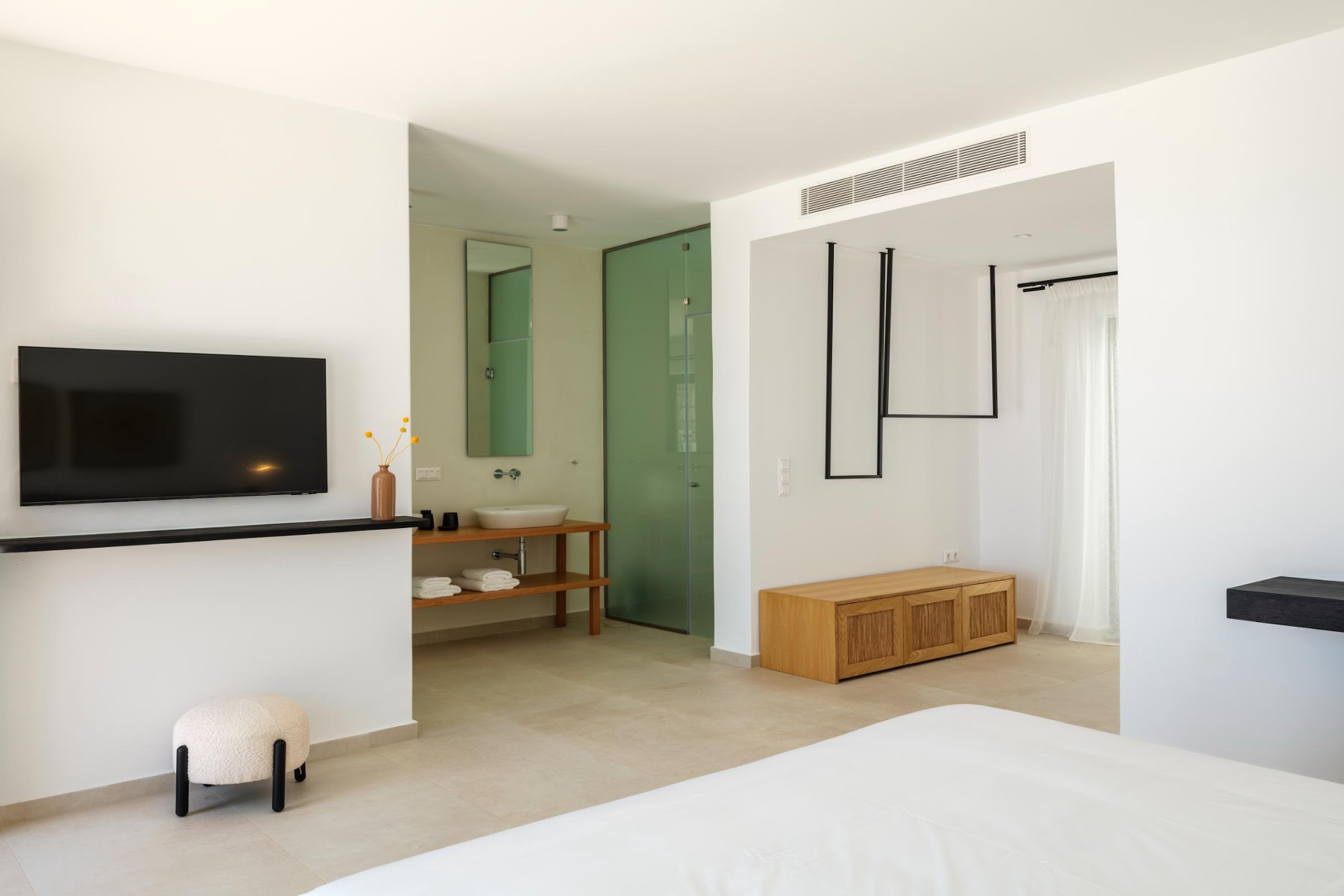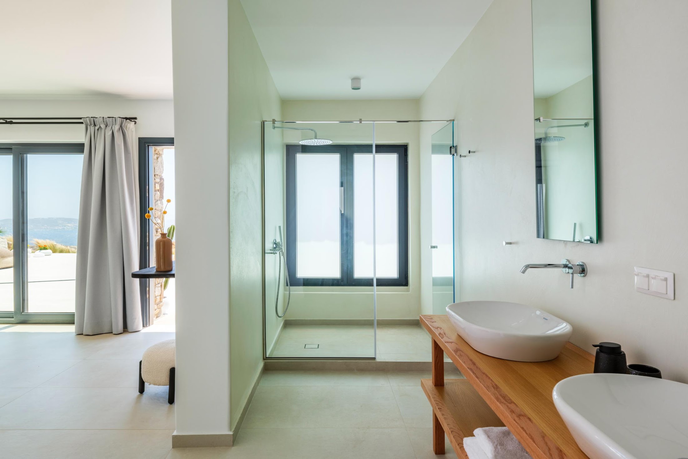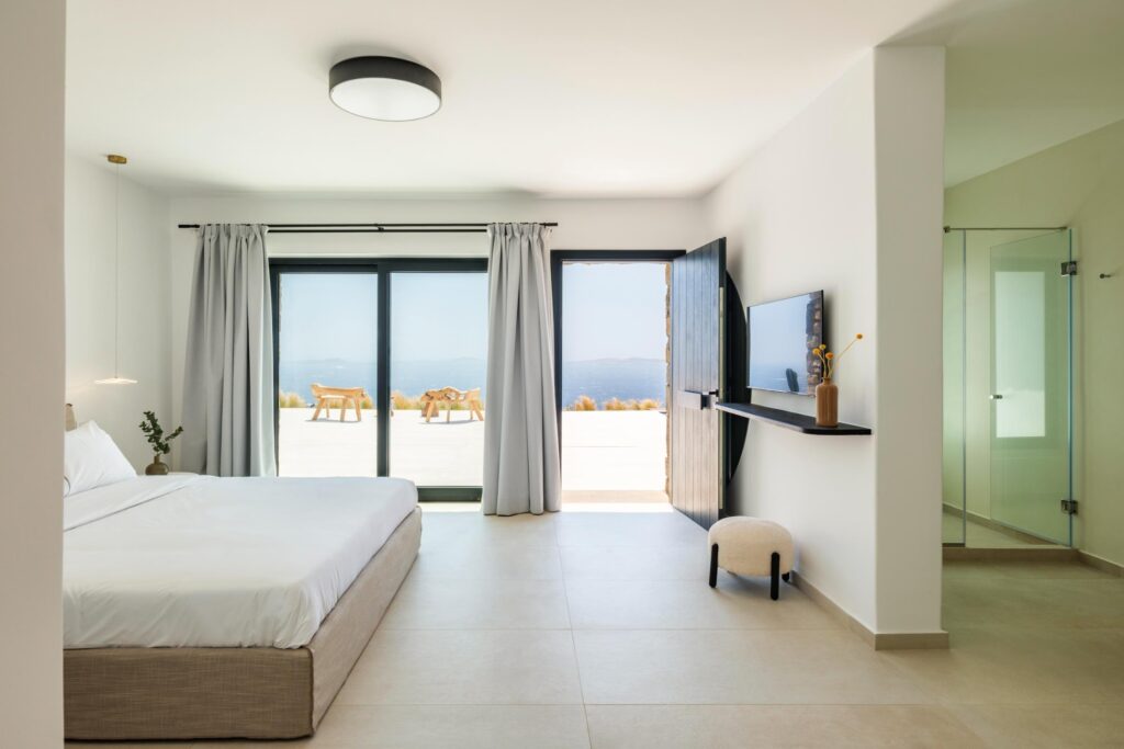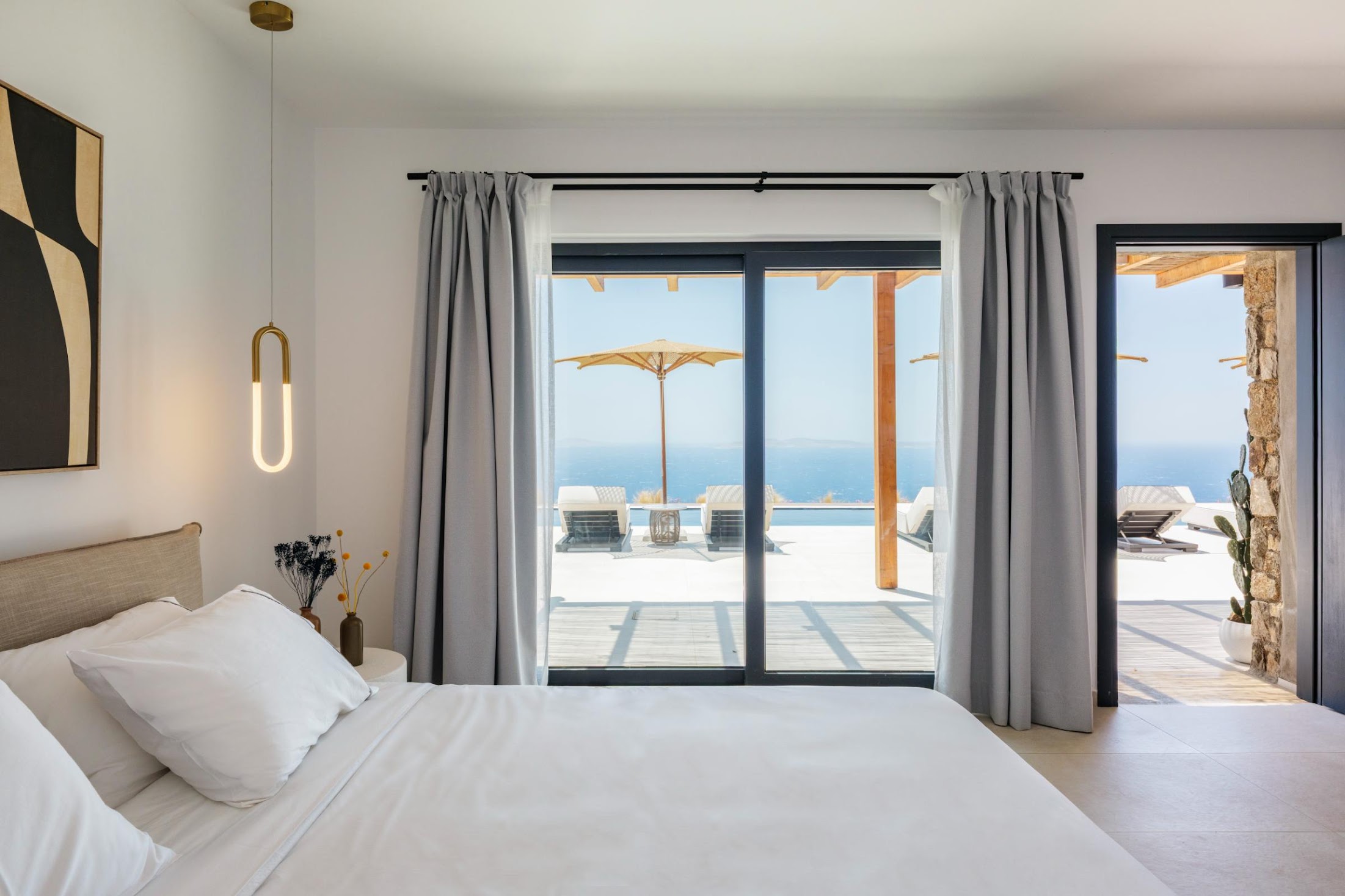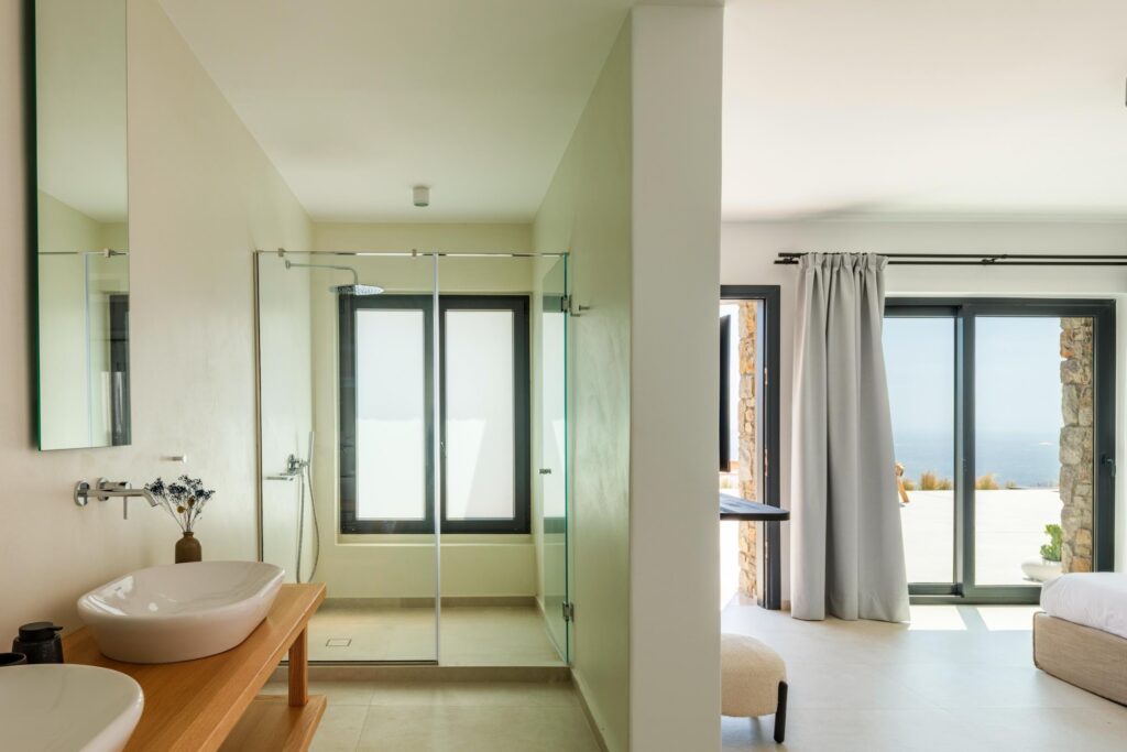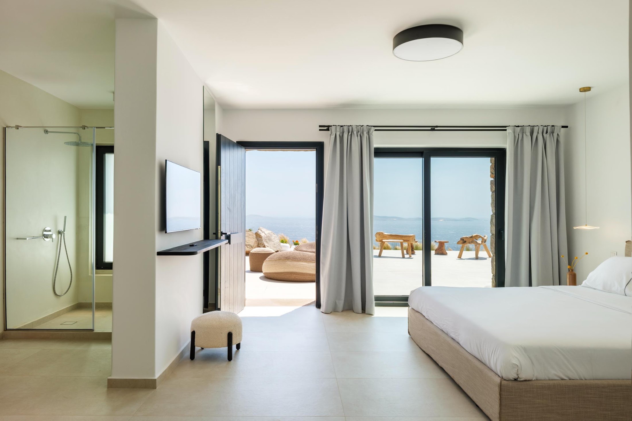 Each bedroom features a modern en suite bathroom and direct access to a private balcony with uninterrupted Aegean Sea and sunset views. These rooms offer elevated privacy and stunning scenery from sunrise to dusk.