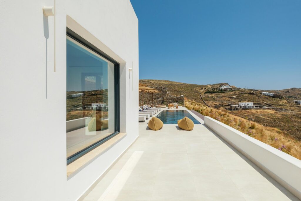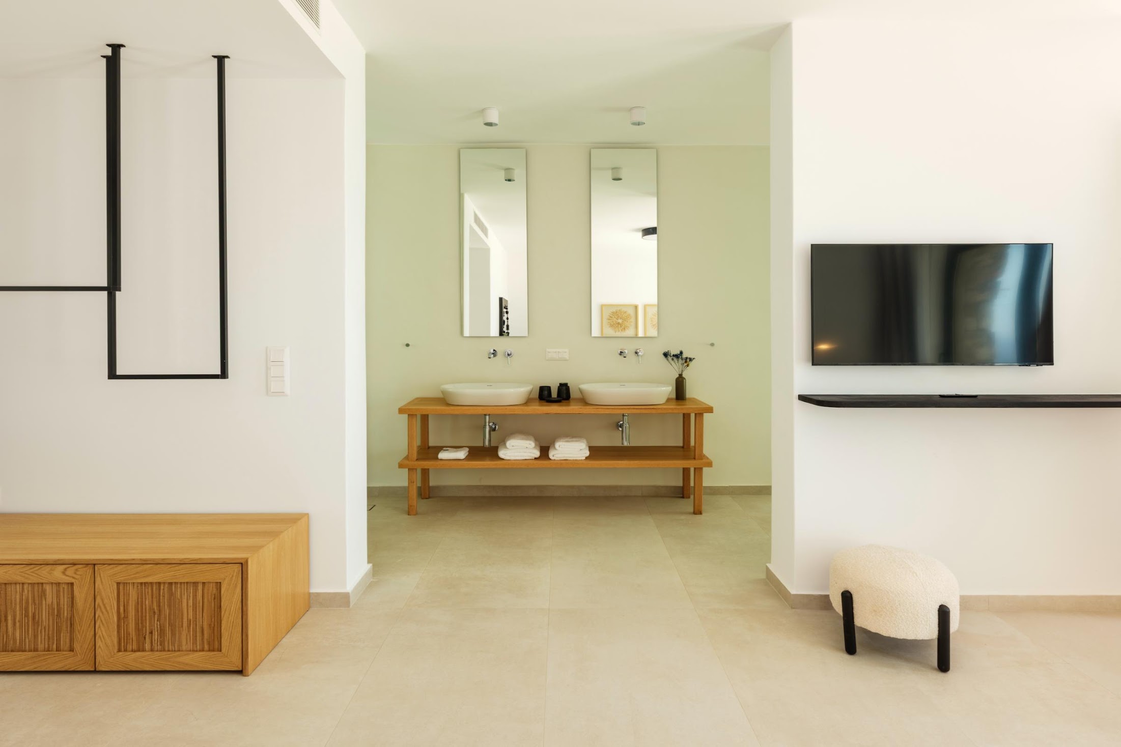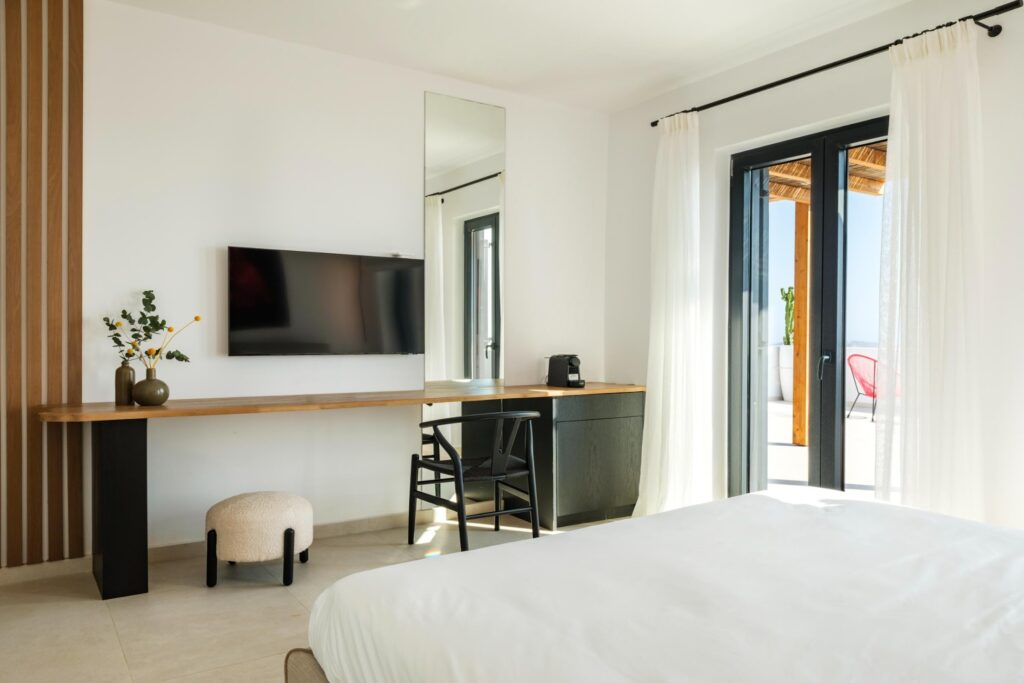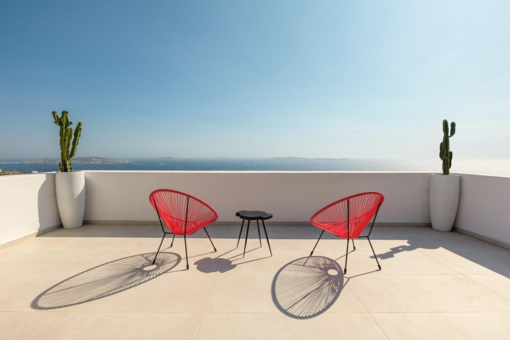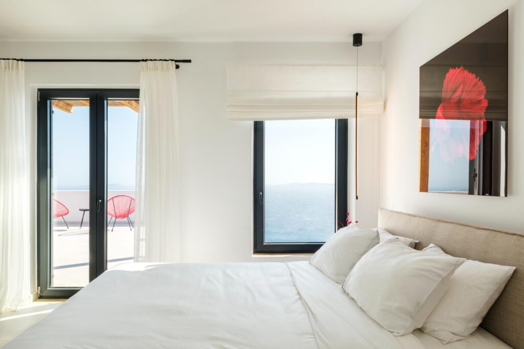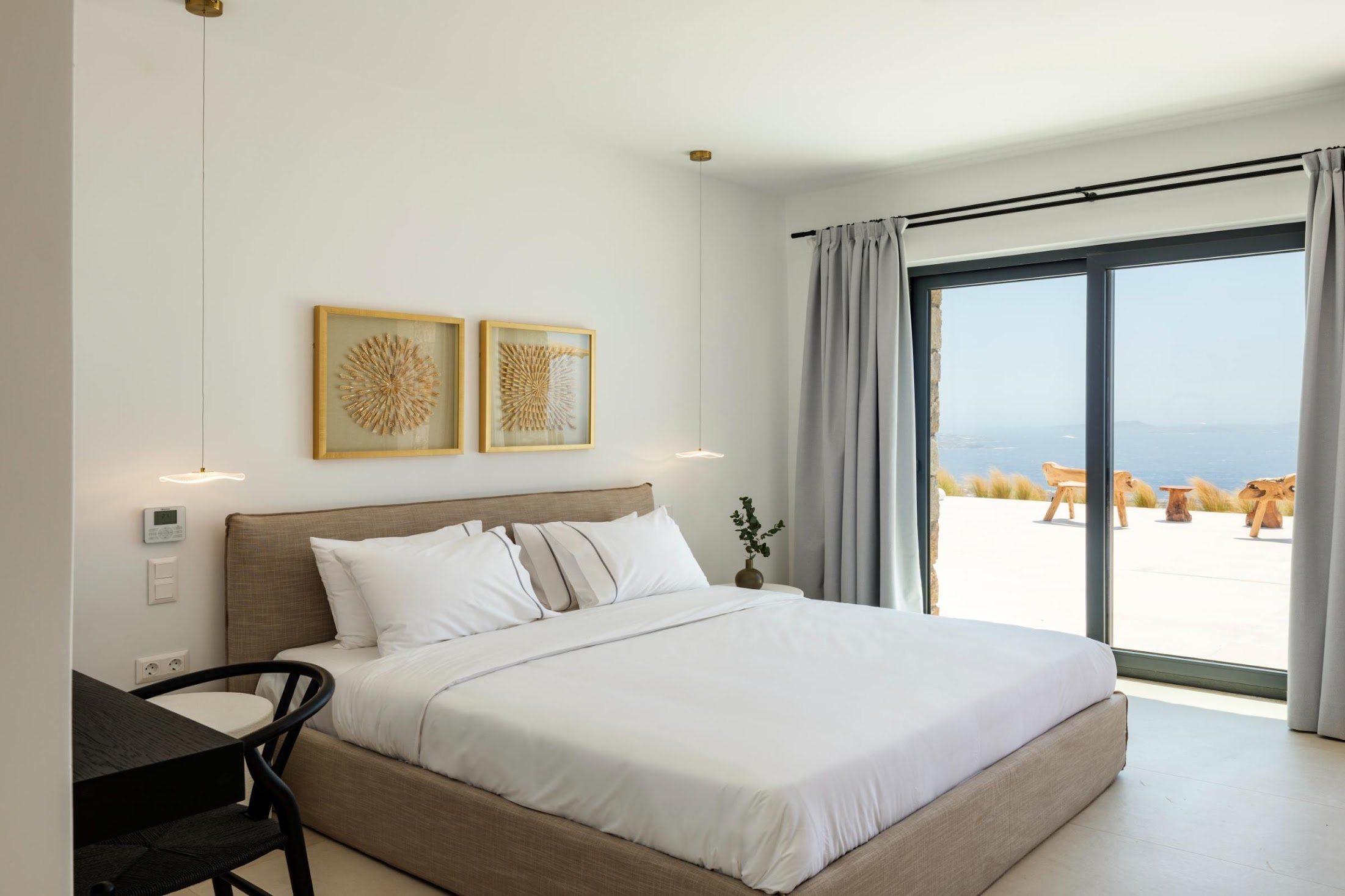 Each bedroom features a modern en suite bathroom and direct access to a private balcony with uninterrupted Aegean Sea and sunset views. These rooms offer elevated privacy and stunning scenery from sunrise to dusk.