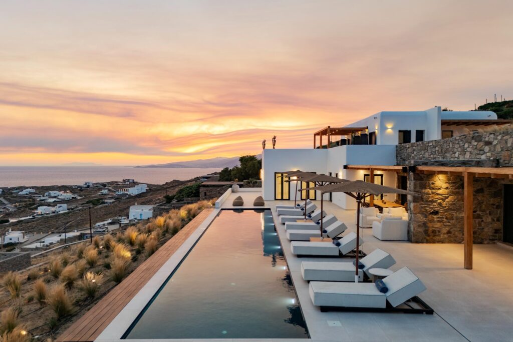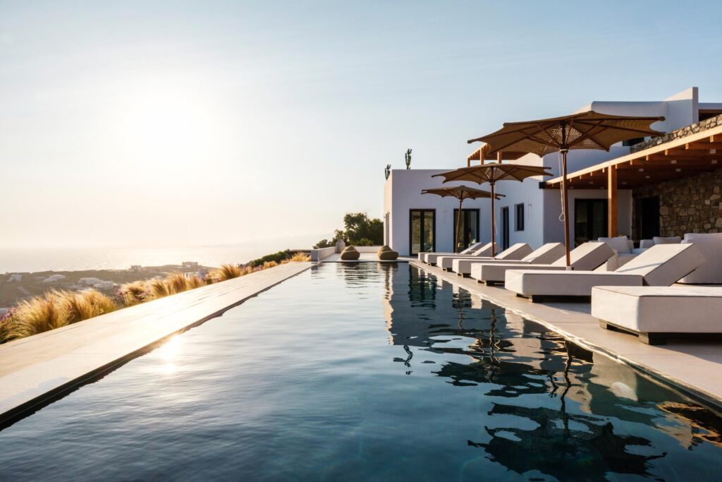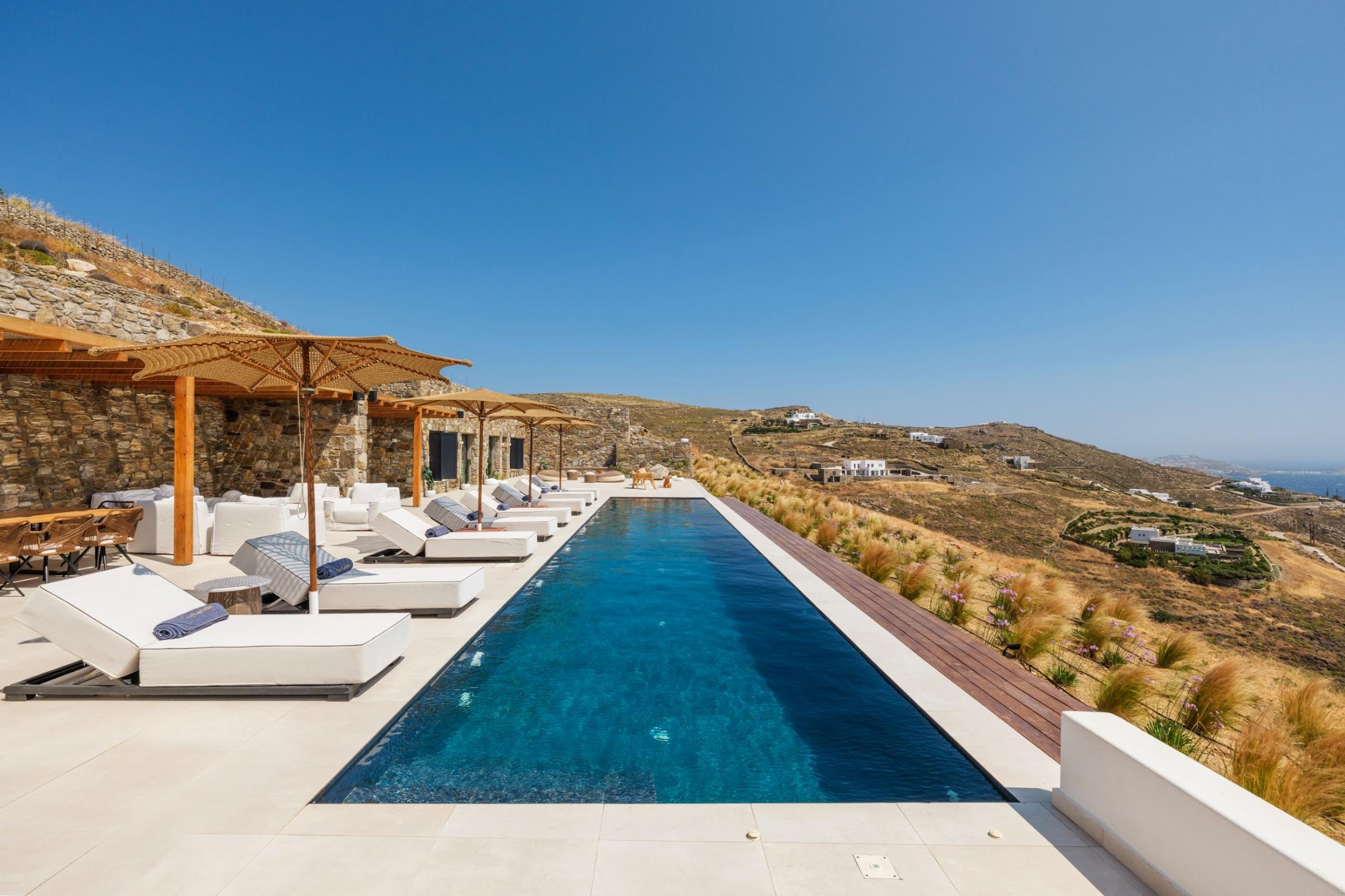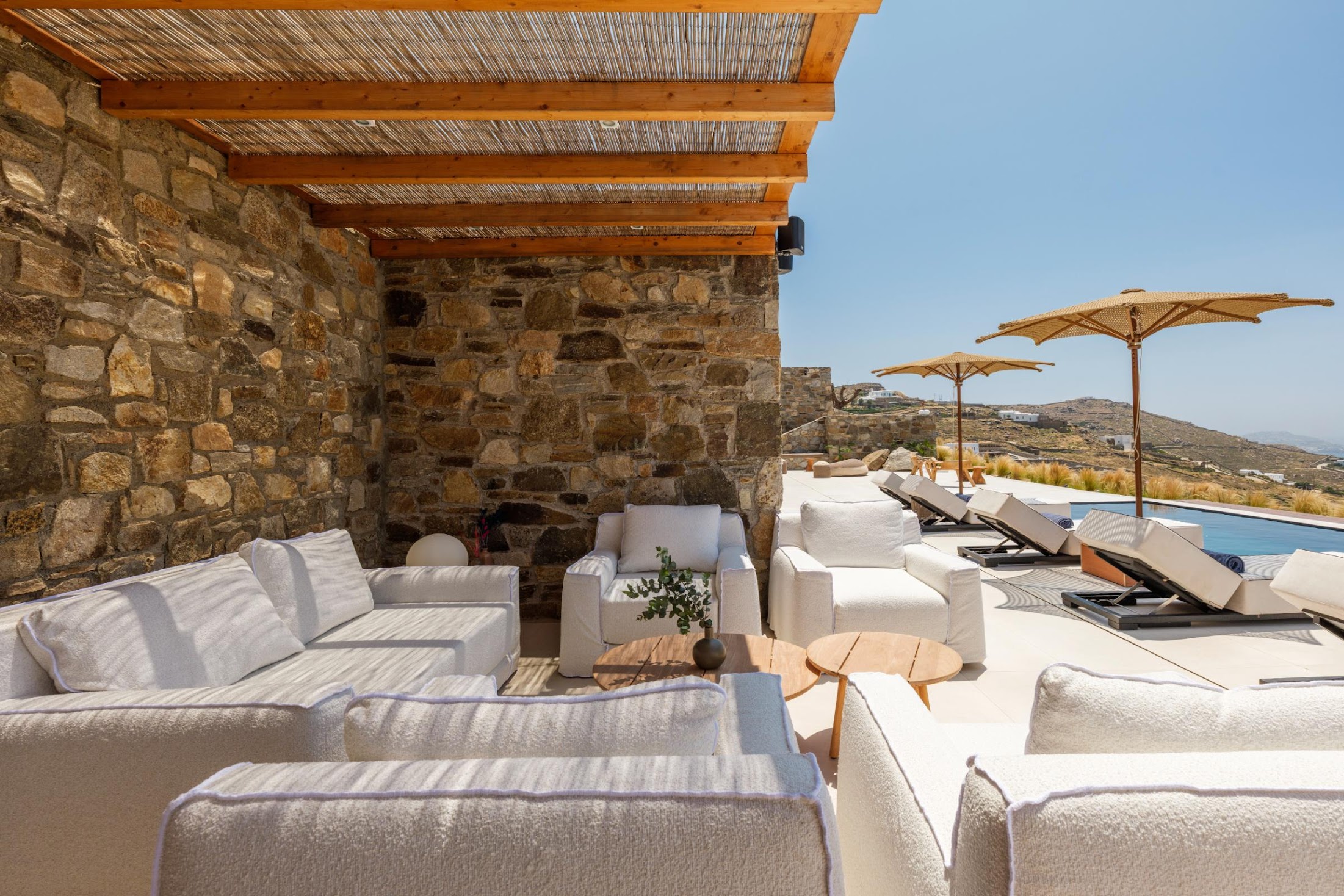 The outdoor area features an infinity heated pool overlooking the Aegean Sea, expansive shaded lounge areas for relaxation, multiple dining spaces ideal for group meals or sunset gatherings, and panoramic views from every corner of the terrace.