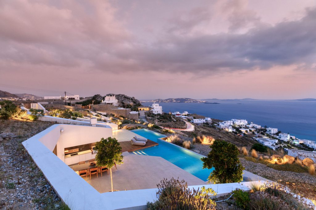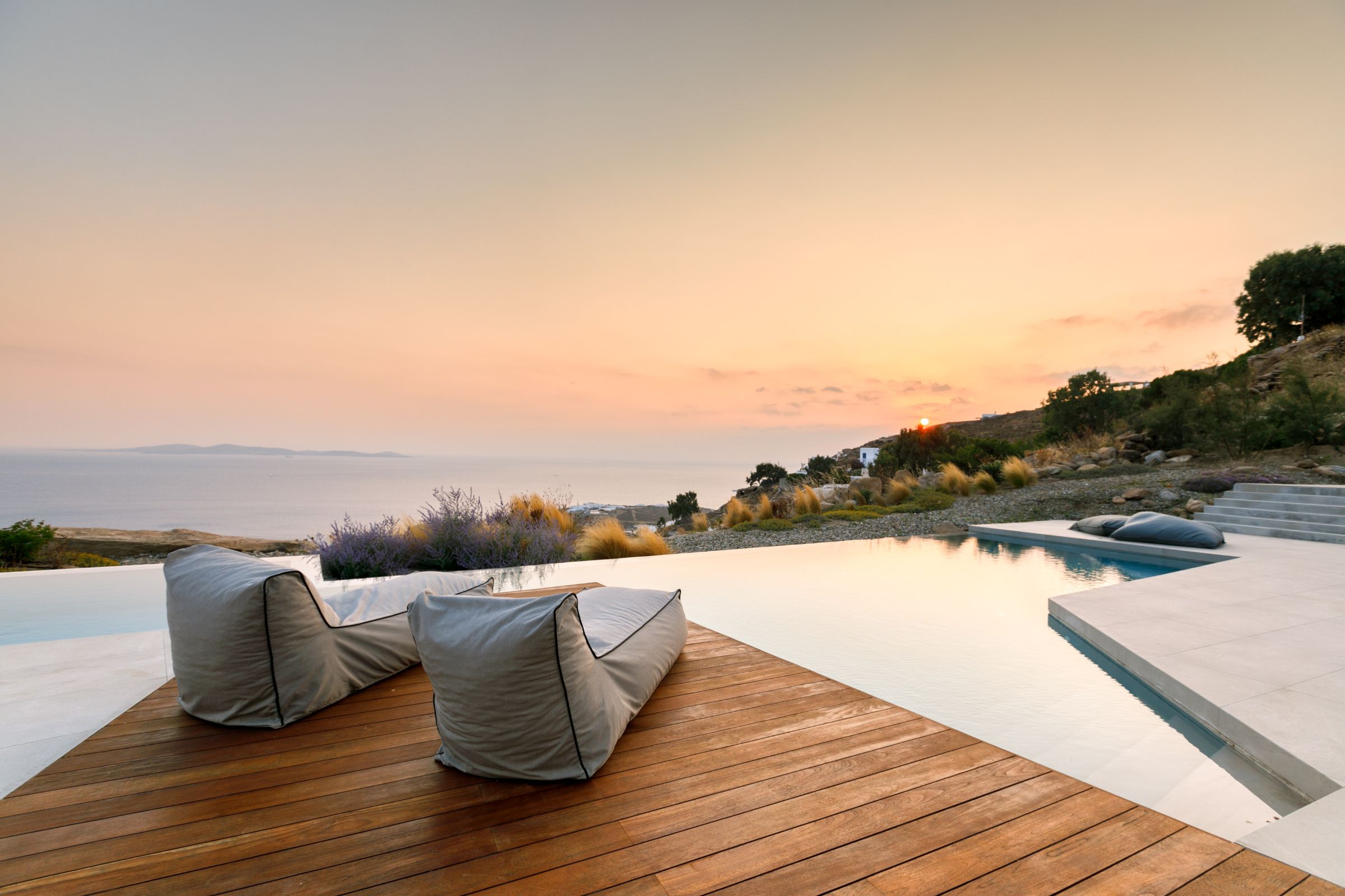 The infinity pool looks out over the sparkling Aegean with the beach of Agios Stefanos below.