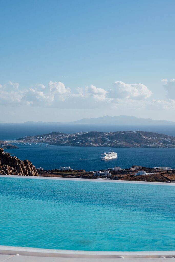 Outdoor spaces include a private infinity pool with sunbeds, a shaded lounge, and a dining area. Multiple balconies provide extra lounge and dining spots, all overlooking the sea and sunset.