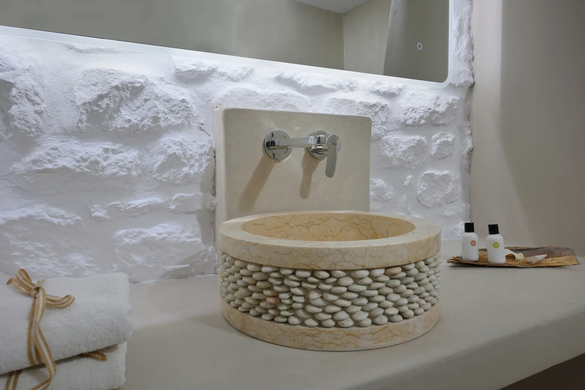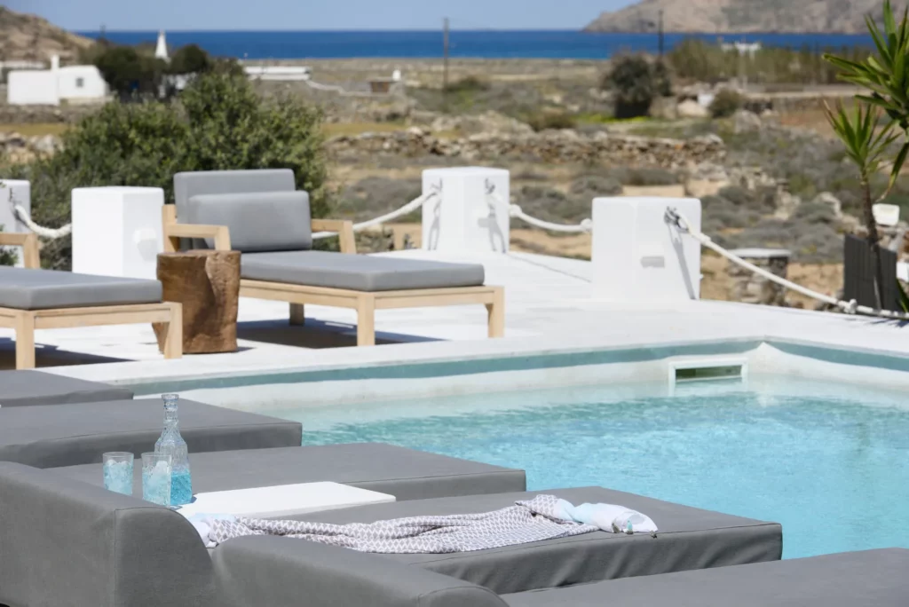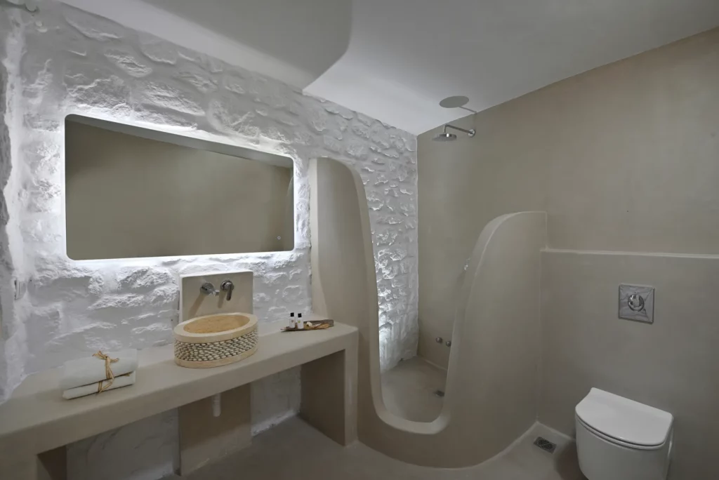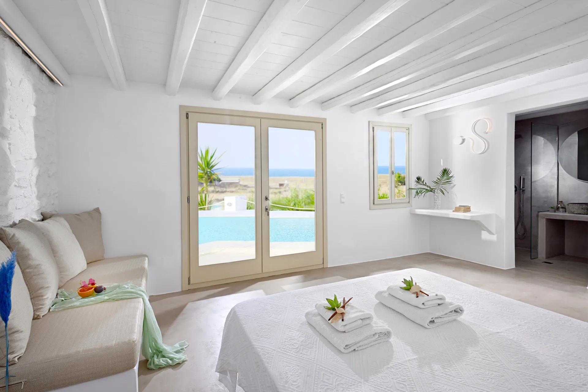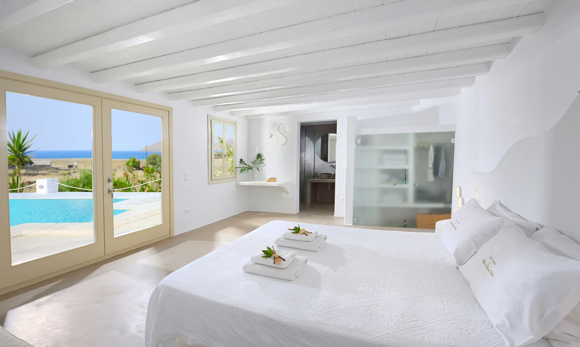 On the same level, there is a generously sized bedroom that opens onto a charming balcony with romantic sea views. An internal staircase leads down to two luxurious bedrooms on the ground floor, which have direct access to a stunning marble terrace, an outdoor lounge area, and a private crystal-clear swimming pool.