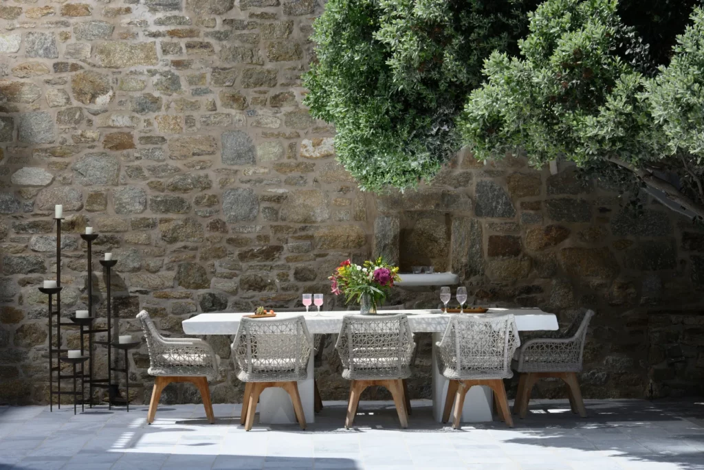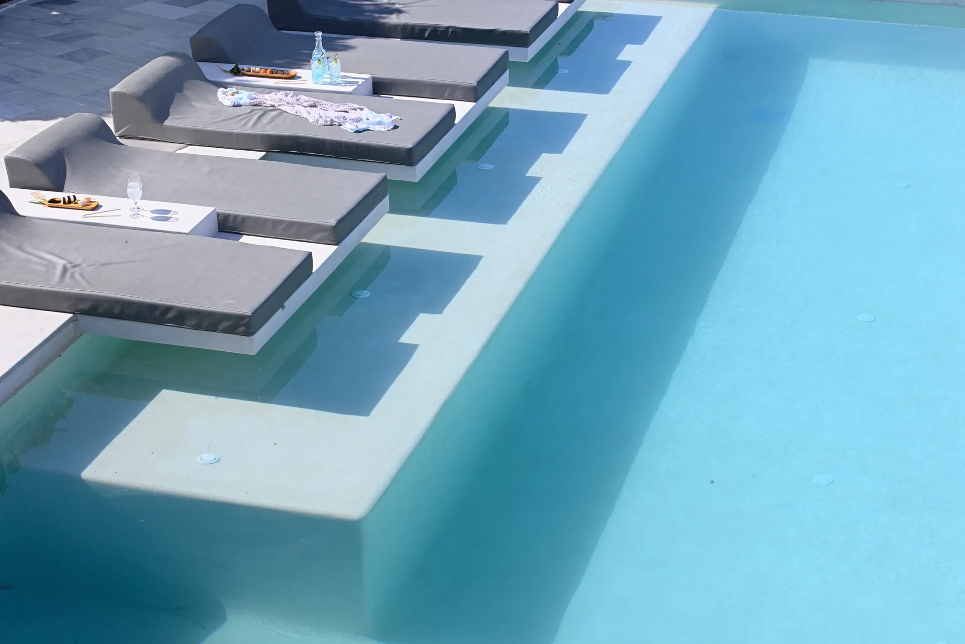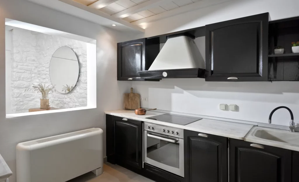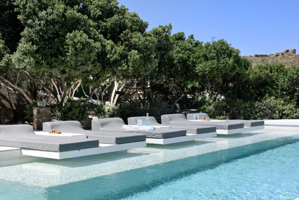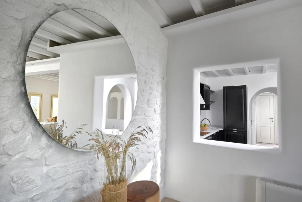 On the same level, there is a generously sized bedroom that opens onto a charming balcony with romantic sea views. An internal staircase leads down to two luxurious bedrooms on the ground floor, which have direct access to a stunning marble terrace, an outdoor lounge area, and a private crystal-clear swimming pool.