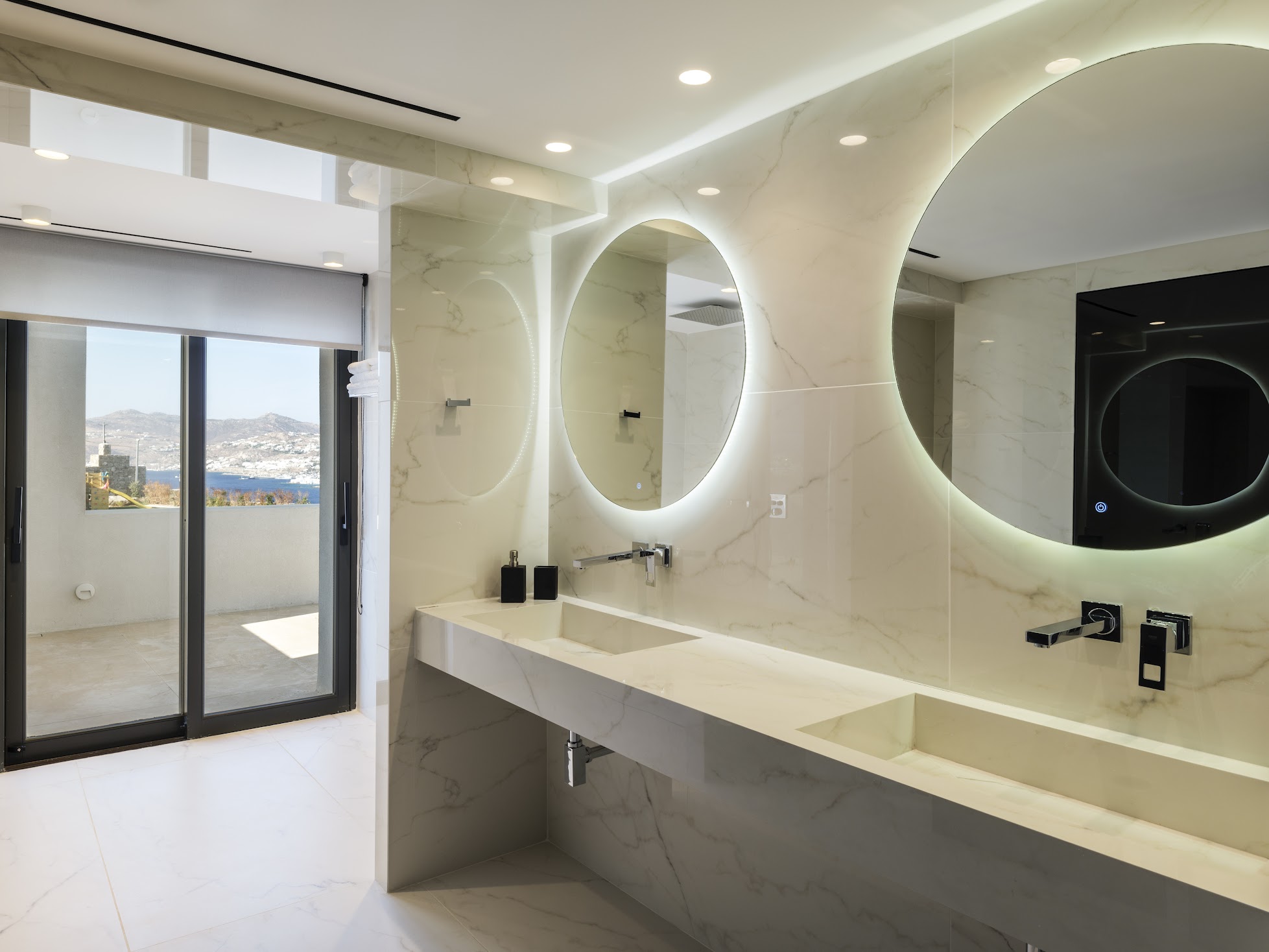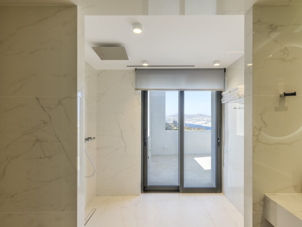 Two double bedrooms with ensuite bathrooms, sea views, and direct access to the outdoor area.