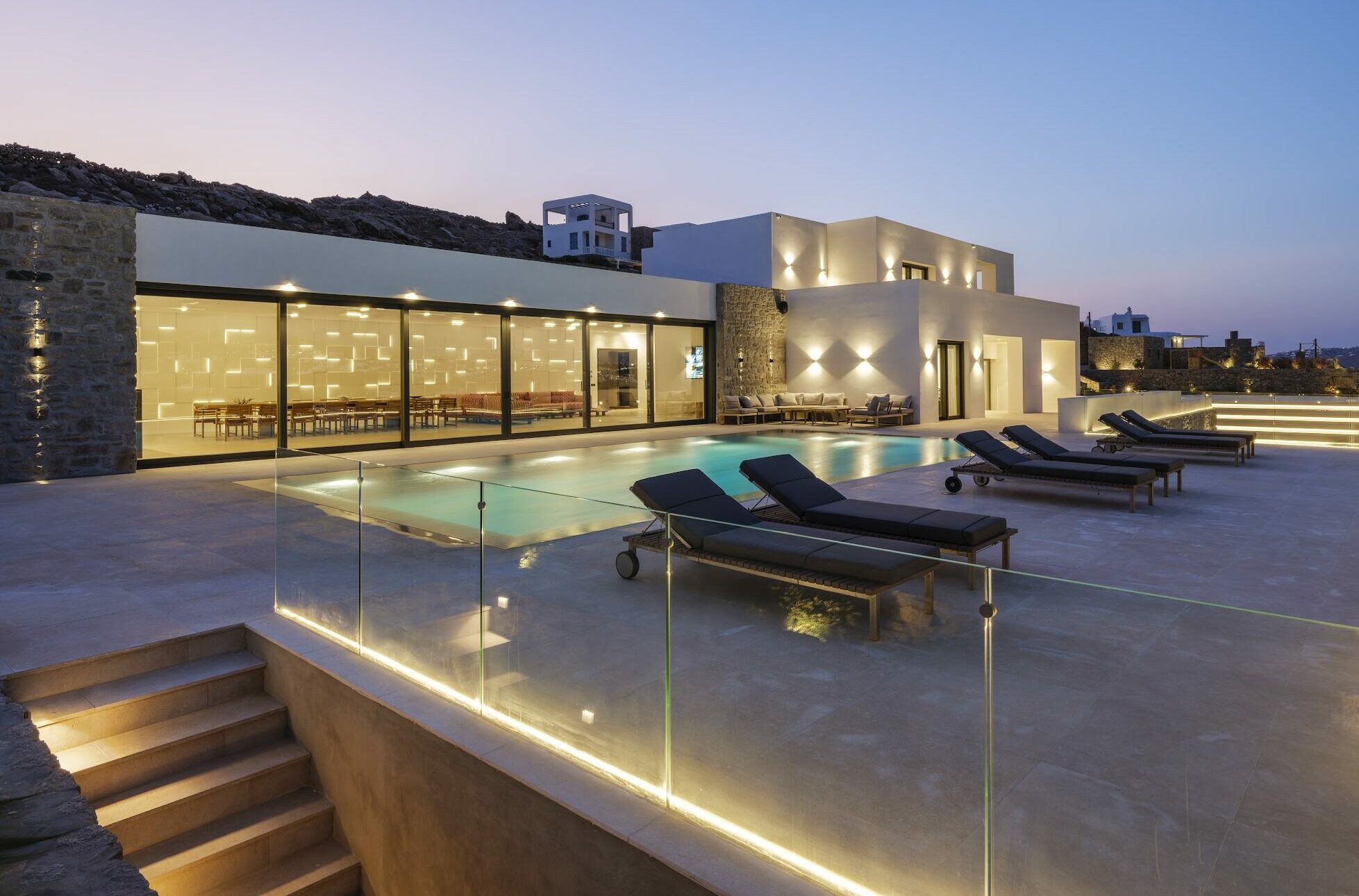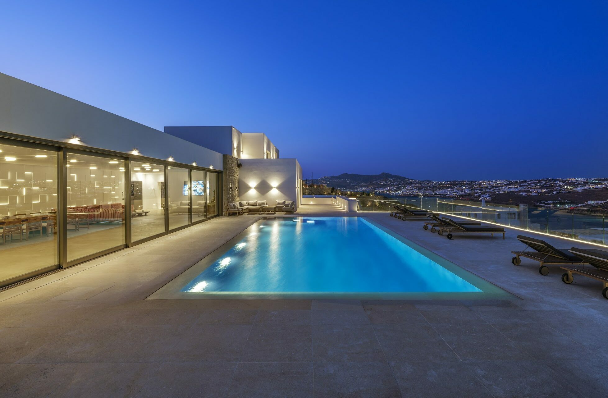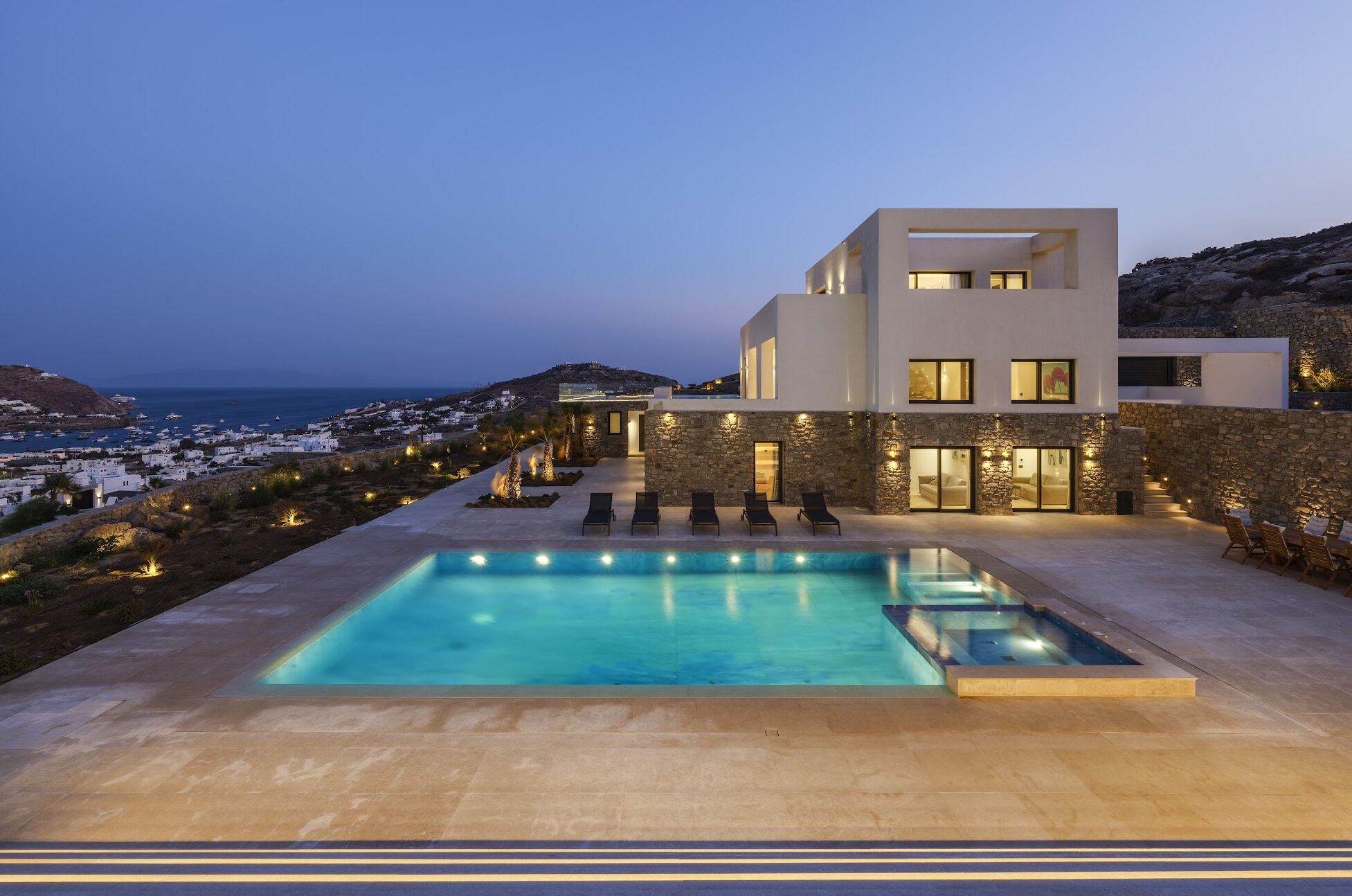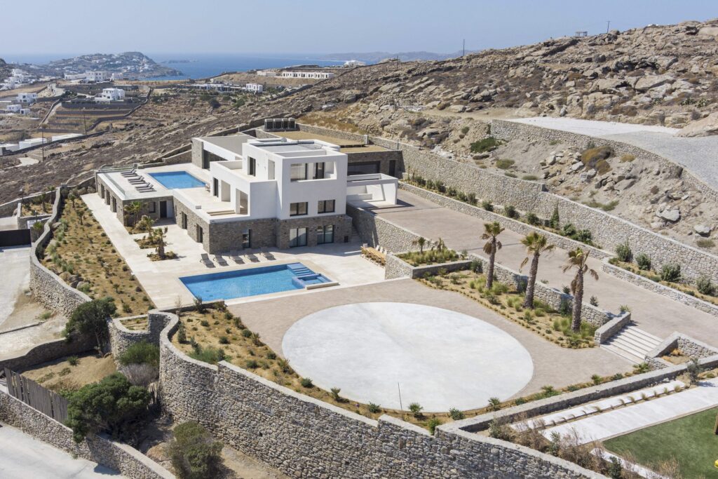 Villa Korfos Azure is a stunning, newly built villa offering breathtaking panoramic views of Korfos Bay, Ornos Beach, and the iconic Mykonos Town. Ideally located near the town, it provides easy access to popular beaches, renowned restaurants, and the vibrant nightlife of the island. Guests can enjoy unforgettable sunsets from the expansive outdoor areas, designed for both relaxation and entertainment, and benefit from the exclusivity of a private helipad, making it the ultimate island retreat.
