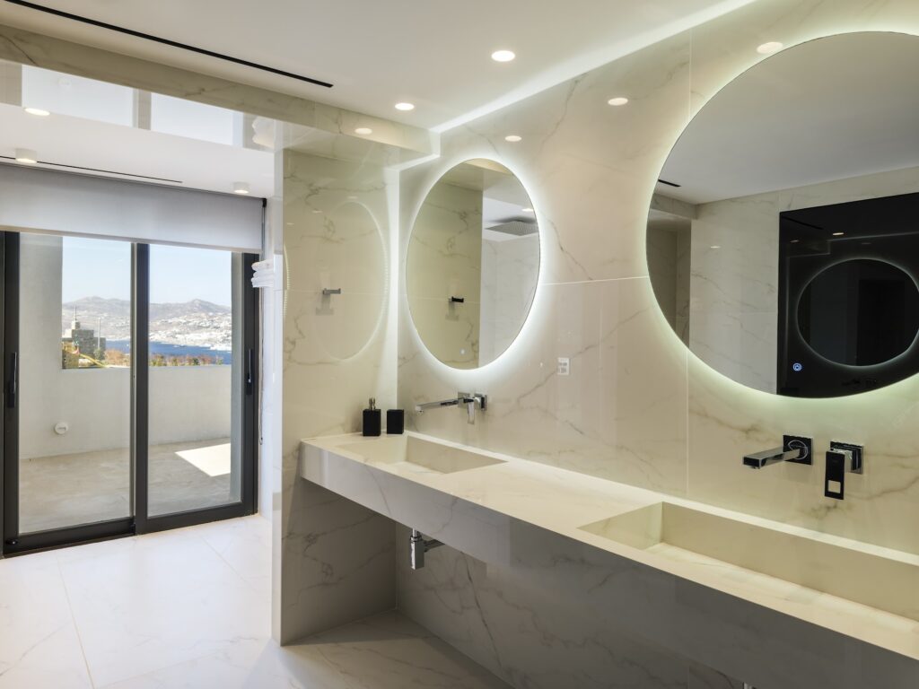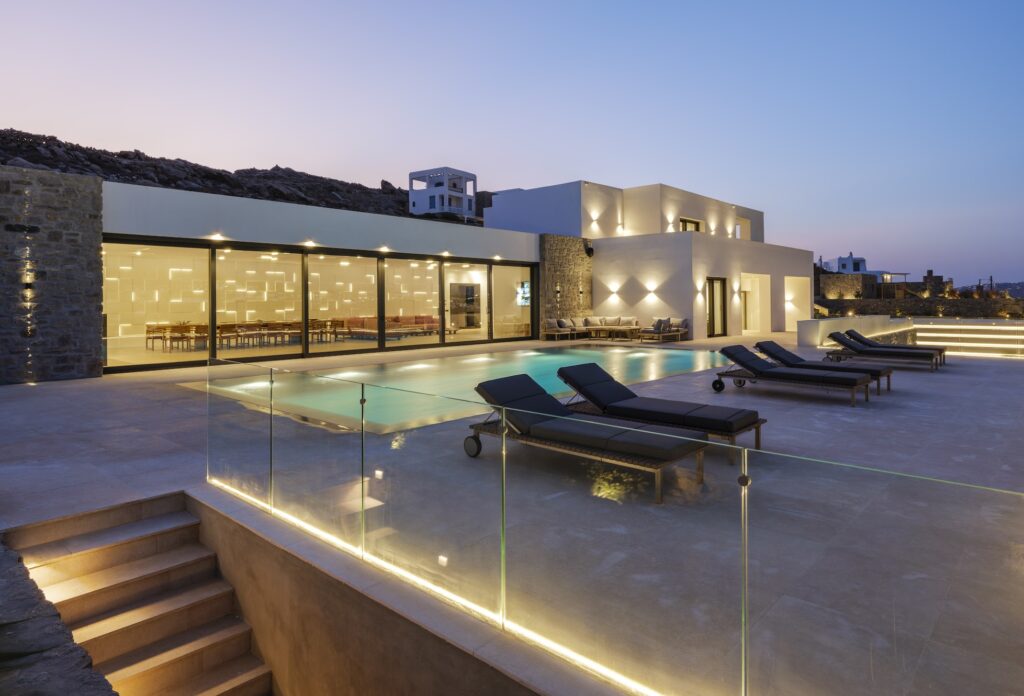 The outdoor spaces at Villa Korfos Azure are designed for both leisure and entertainment, featuring two impressive swimming pools, a luxurious Jacuzzi, and a playground, making it ideal for families or groups.