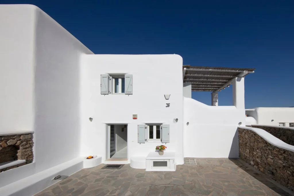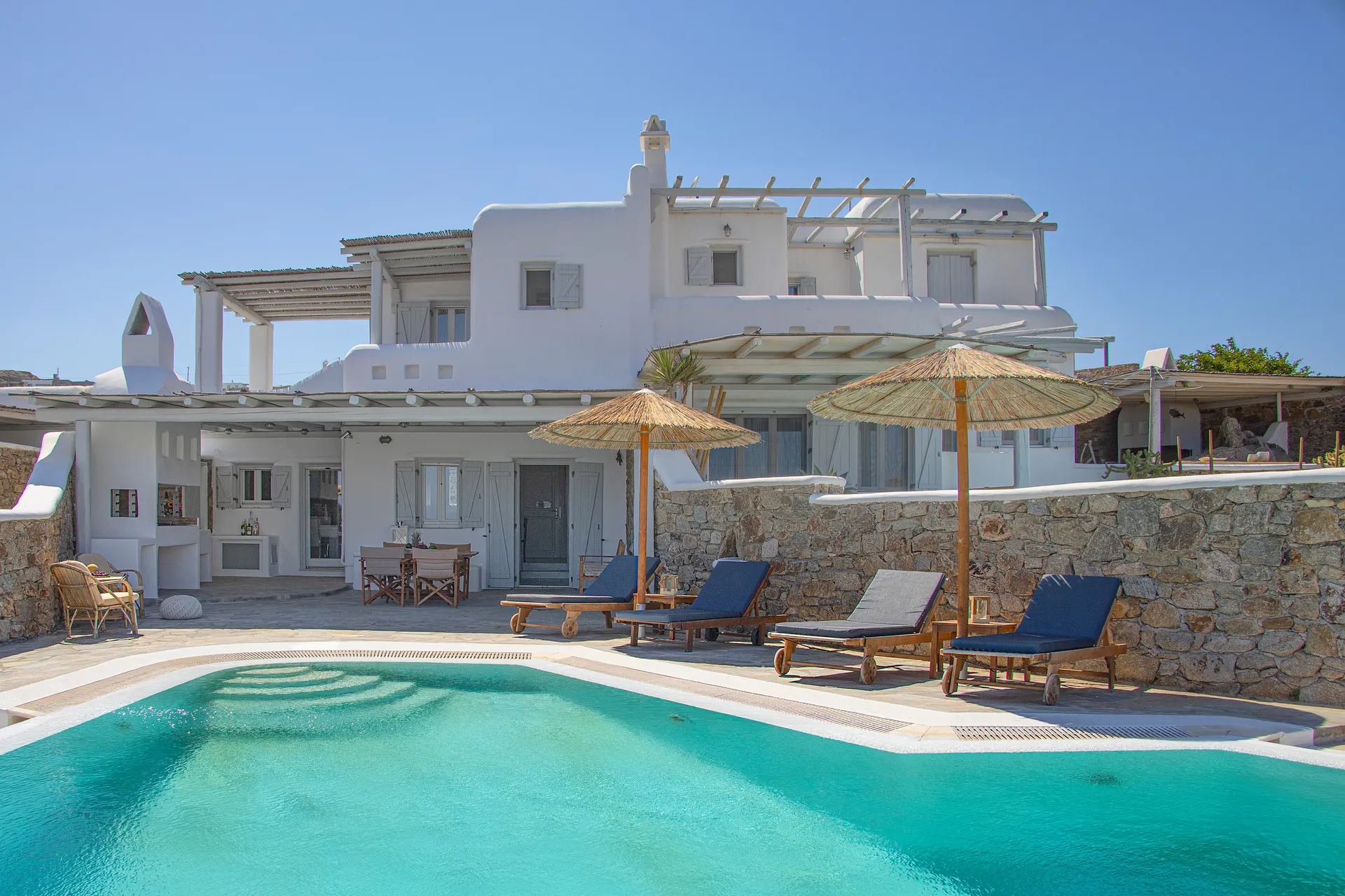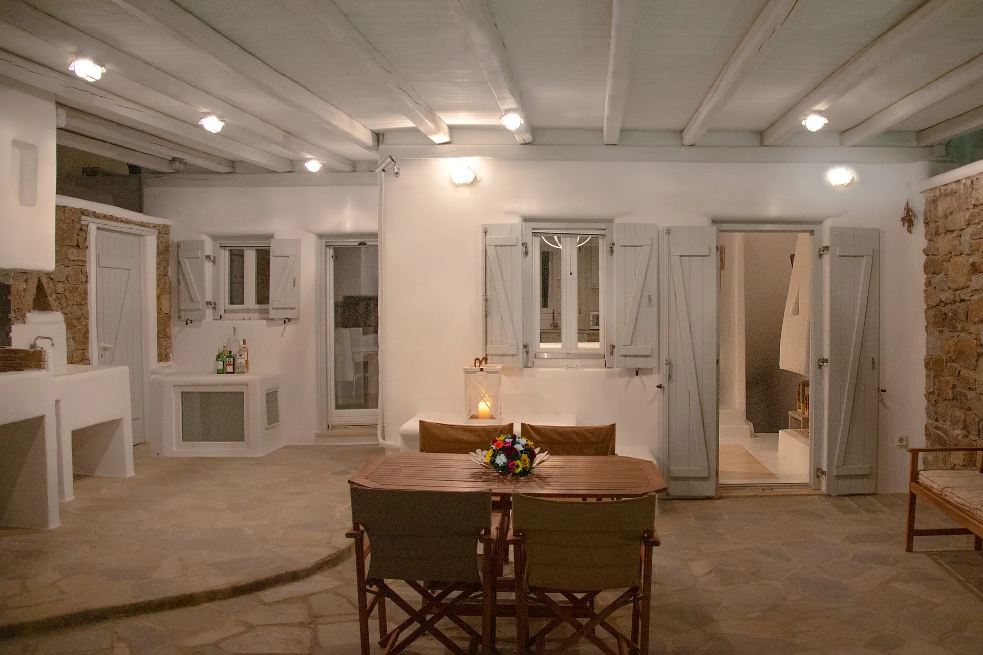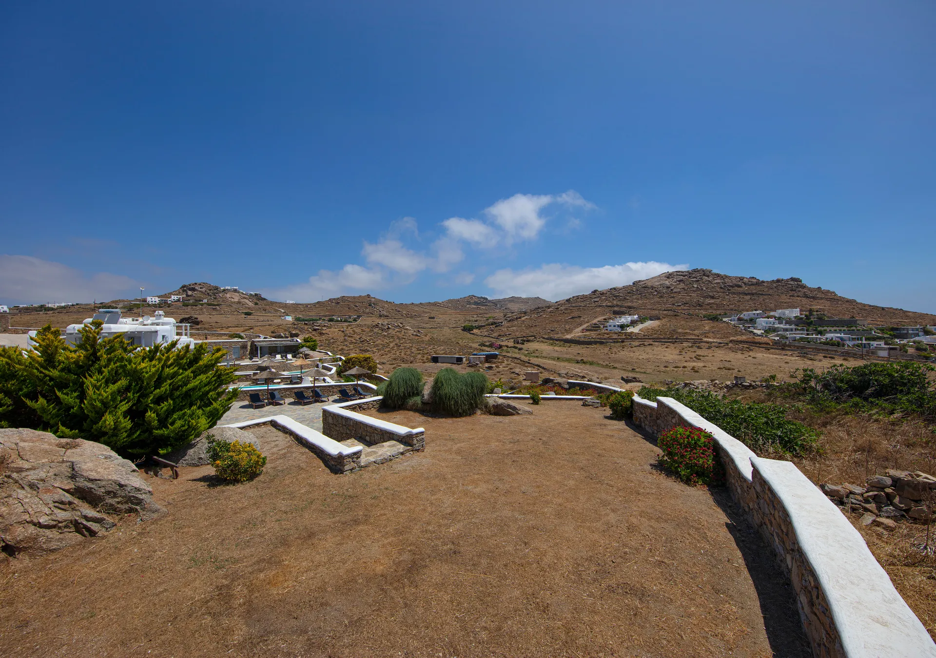 The villa is set in the tranquil area of Kalafatis, less than 2 km from the beach, offering an ideal setting for a dream getaway. Part of a collection of independent villas, it blends traditional Mykonian architecture with modern comforts.