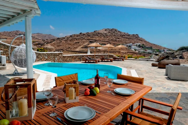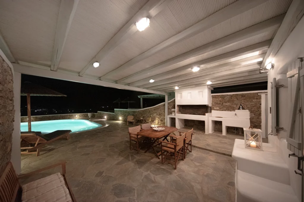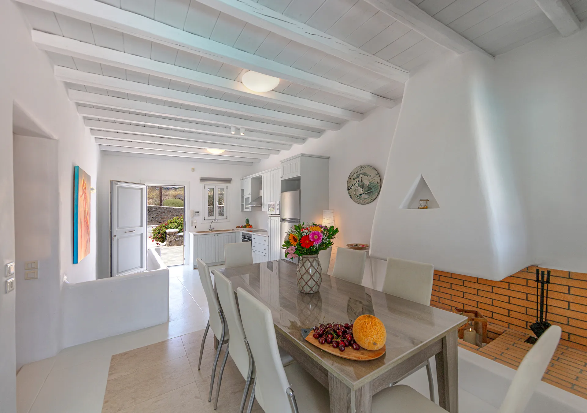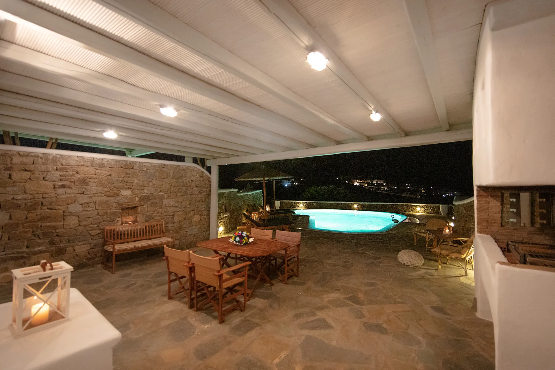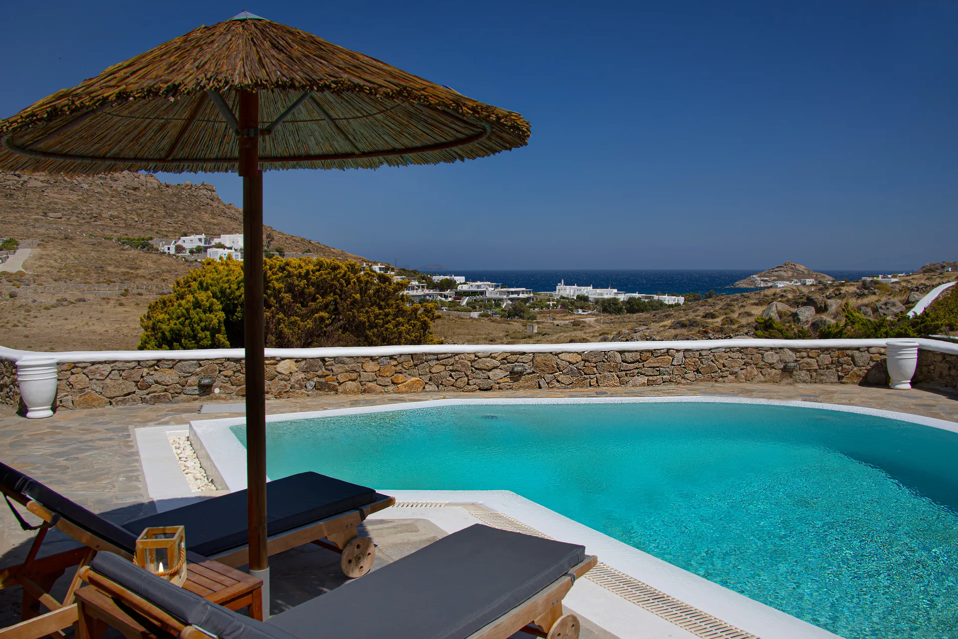 The villa is set in the tranquil area of Kalafatis, less than 2 km from the beach, offering an ideal setting for a dream getaway. Part of a collection of independent villas, it blends traditional Mykonian architecture with modern comforts.