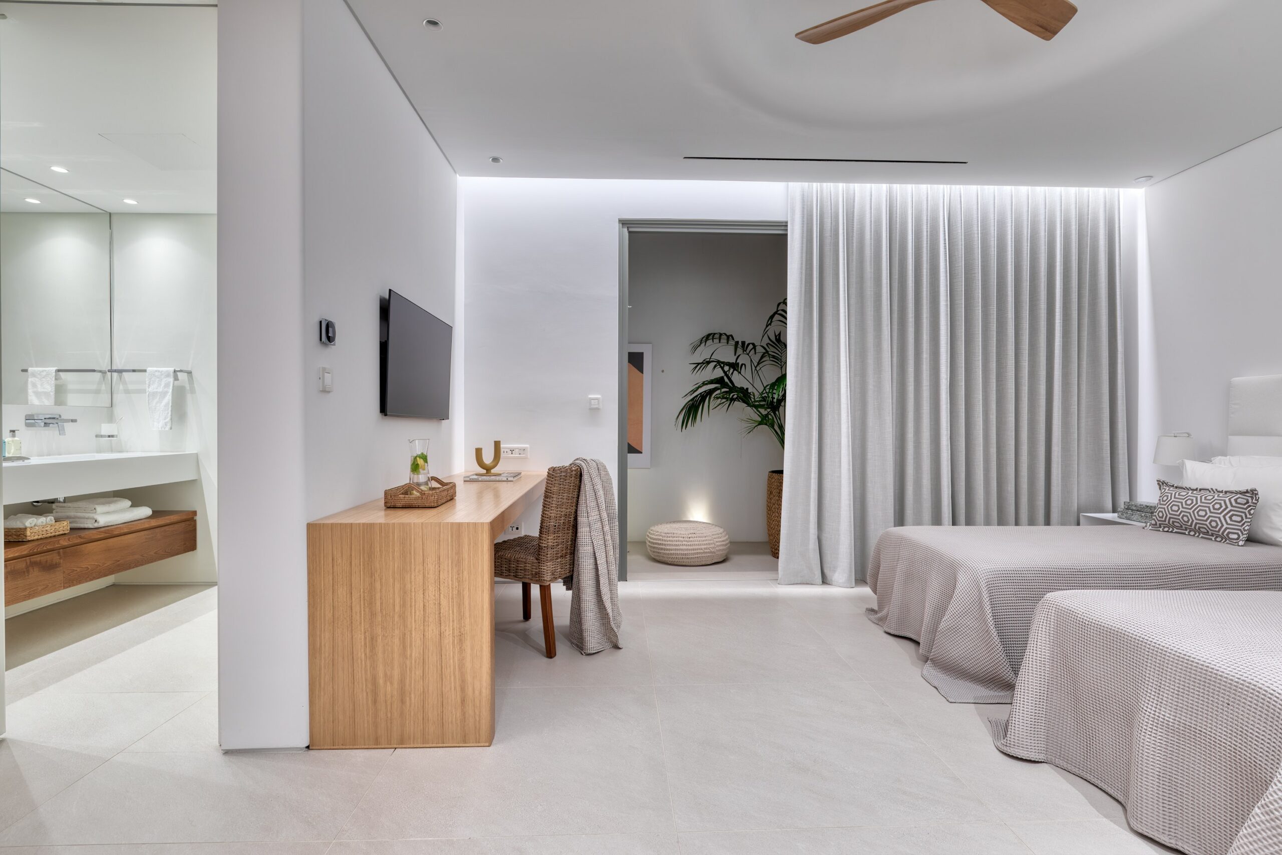Double bedroom with king-size bed (or 2 single beds), smart TV, central ventilation system, and en-suite bathroom. Access to a terrace with sea views.