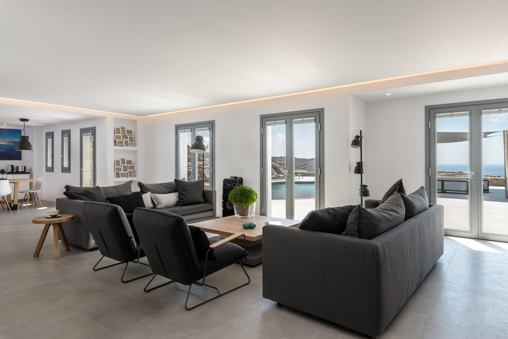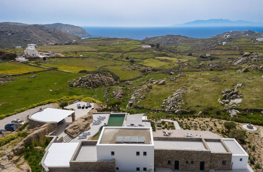 The private estate has grounds of 5,400 meters and looks down towards the beach of Agrari.