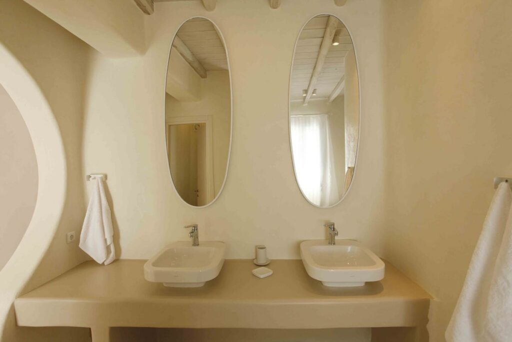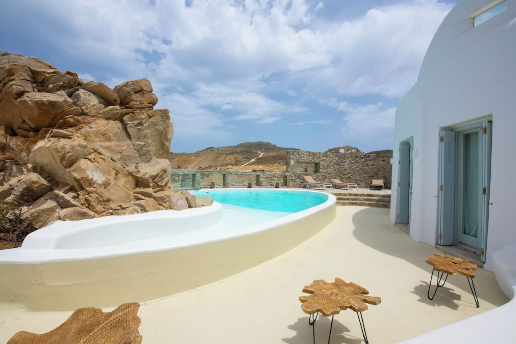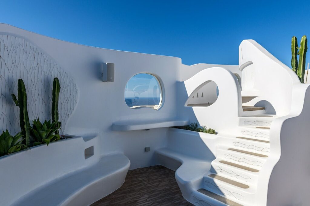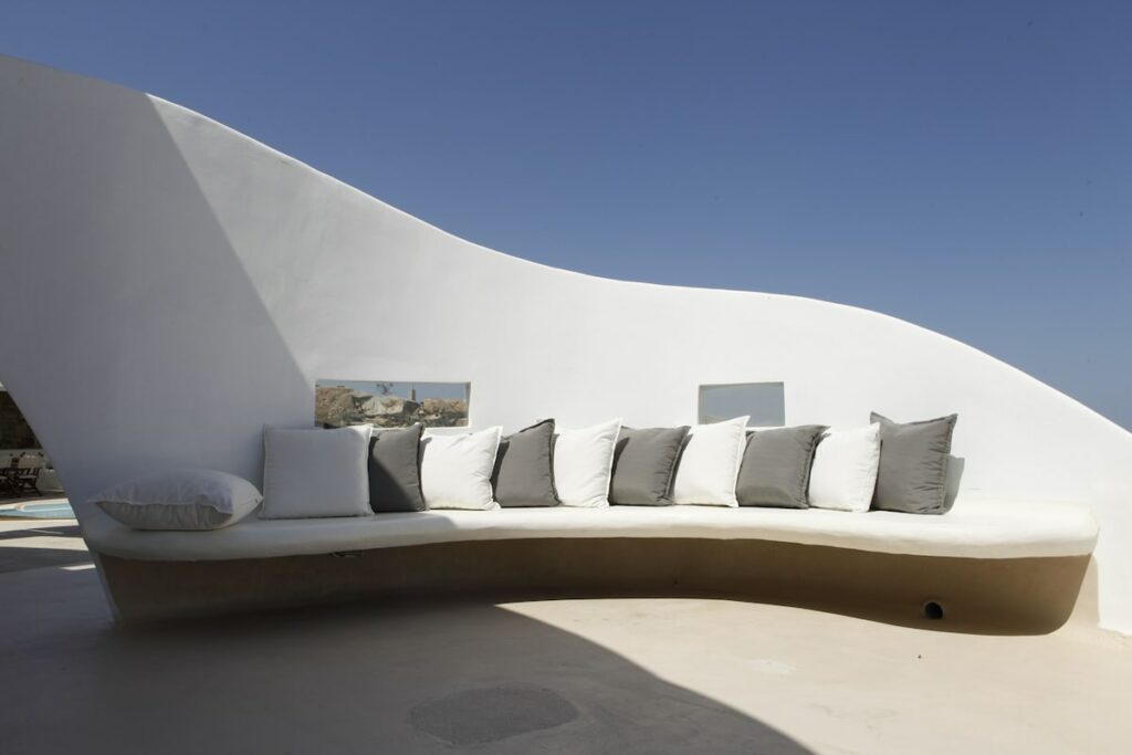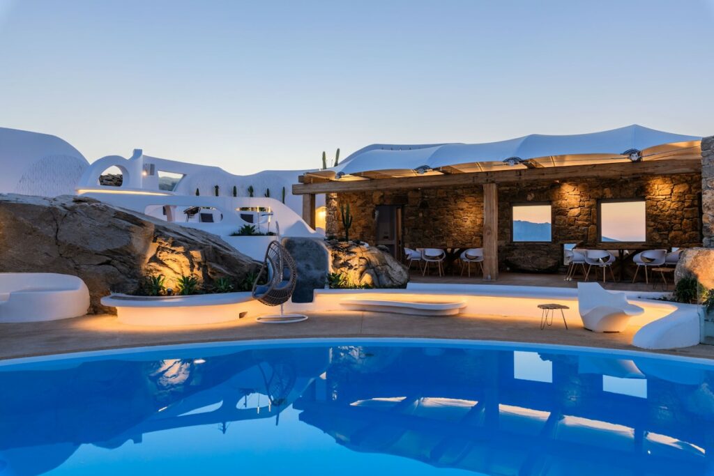 The architectural design, curated by Aktis Design and inspired by traditional Cycladic handcrafted architecture, blends timeless aesthetics with modern comfort across both indoor and outdoor living spaces.