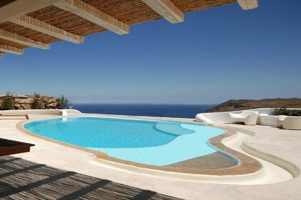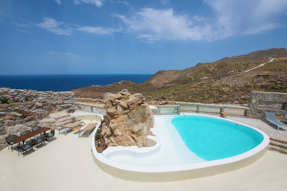 The villa offers expansive indoor and outdoor living spaces, a spectacular multi-level infinity pool protected from the wind, Cycladic-style outdoor seating, BBQ areas, and panoramic sea views.